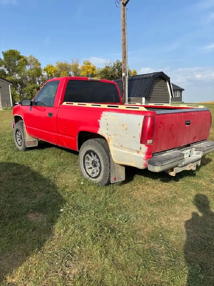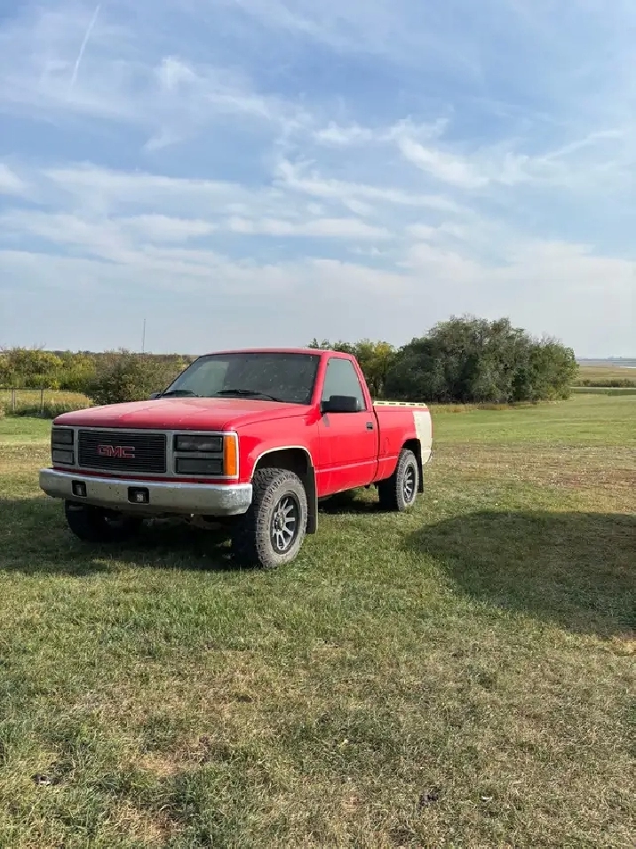 ‘94 Silverado k1500 (GMC grille). Factory 350, 5 speed, 4x4. Air/tilt/cruise. New clutch 2 years ago, resealed the engine at the same time. Plugs/cap/ rotor and wires done this fall. Aftermarket wheels with brand new duratracs on it. Starts, runs, drives, stops. Everything works on it. Price is obo. Call/text (306)-221-3540