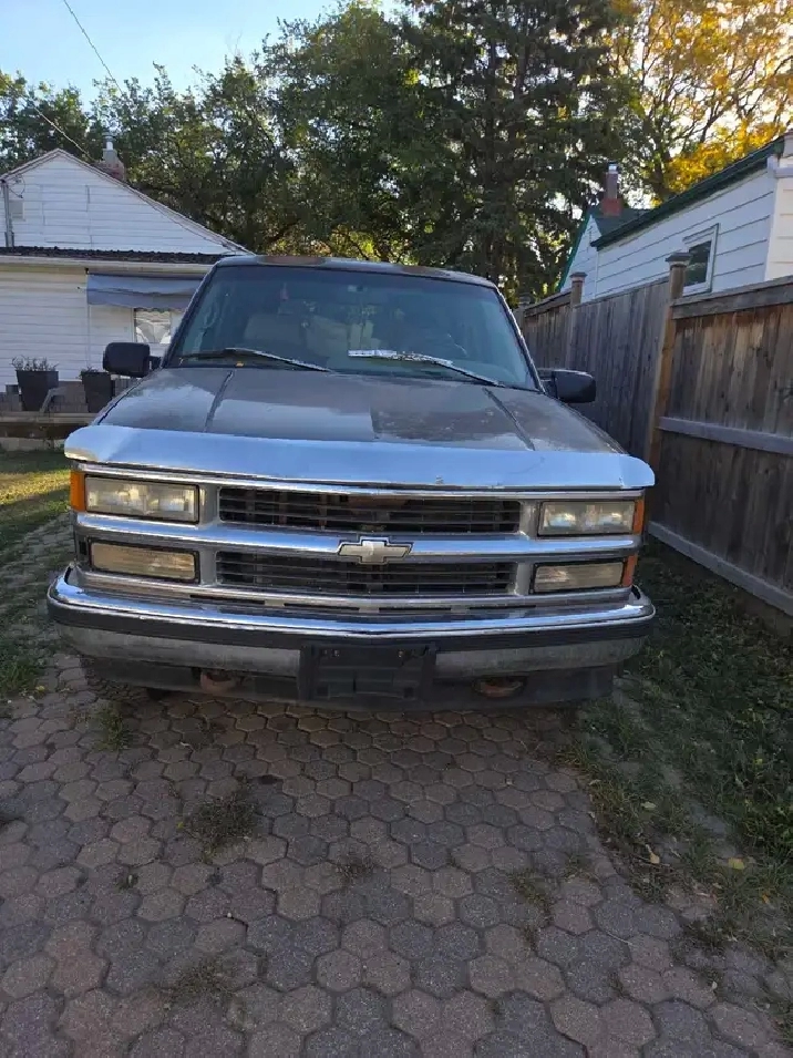 This is Bucky a 1996 chevy suburban k1500 he has brand new tail lights, spark plugs , starter & all weather 3 peak rated tires. He runs and drives great and is super reliable only issues with him is his horn doesnt work, his speedometer cuts out once in a while but i have a dash cluster to replace it also he needs a rear headliner and the inside door handle pin pops out so you have to open it from the outside but its an easy fix. I love this truck dearly but is just too big for me. Looking to get 2600 or best offer. Abs needs replacing and willing to trade for a car. If your interested call or text (639)994-6629.