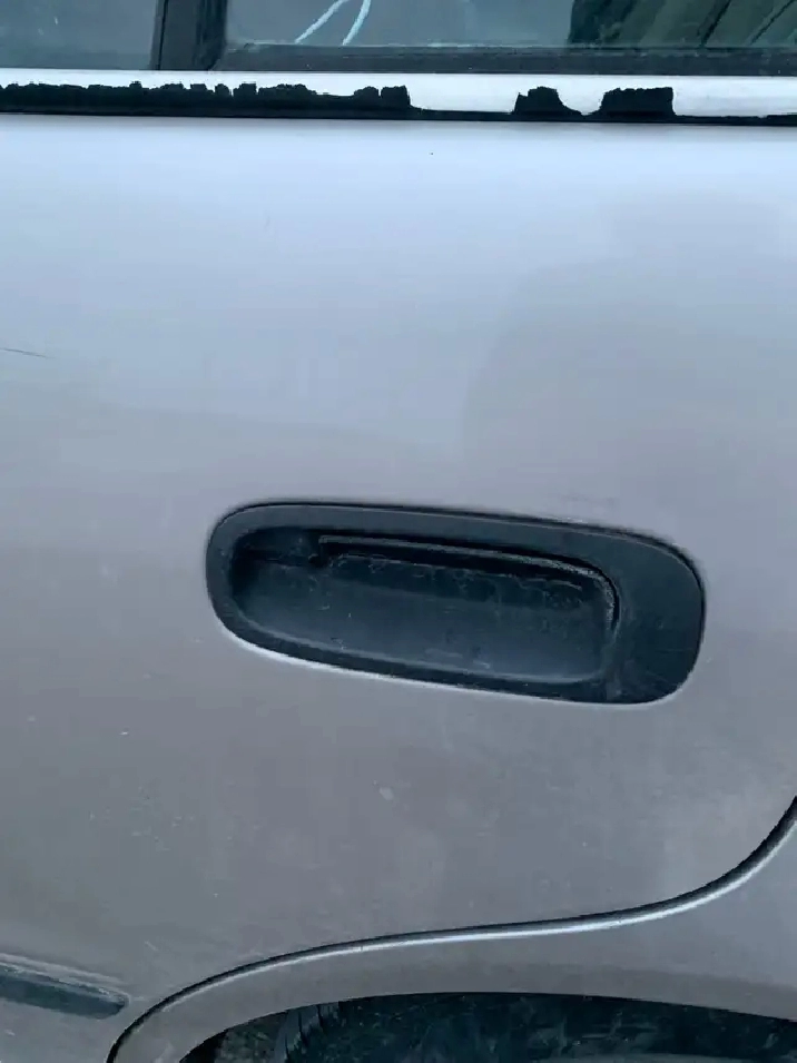 Left rear door only opens from the inside, big old dent in the trunk door but still hitches closed.