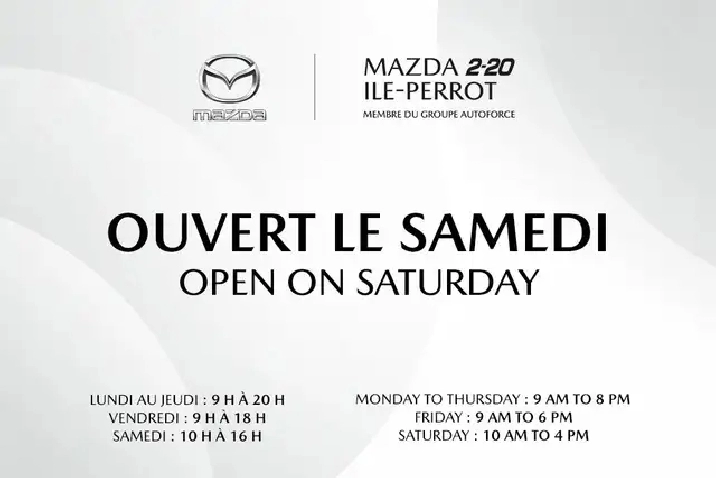 Certified Mazda Dealership in Ile-Perrot, member of Group Autoforce. Wide variety of used vehicles are available for sale with the best prices in t he region of Montreal - Pointe-Claire - Dollard-Des-Ormeaux - Pierrefonds - Roxboro - Kirkland - Beaconsfield - Baie D'Urfé –Senneville - Sainte-Anne-de-Bellevue - Dorval - Longueuil - Ville St-Laurent - Lachine - Lasalle - Saint-Lazare - Vaudreuil - Dorion - Brossard - Chateauguay - Mercier - Rigaud - Les Cèdres - Valleyfield - Coteau-du-Lac - Les Coteaux - Saint-Zotique - Hudson - Pincourt - Ile-Perrot - Saint-Polycarpe - St-Clet. Situé sur l'autoroute 20 à 25 minutes du centre-ville de Montréal et à 12 minutes de l'aéroport de Montréal (YUL).