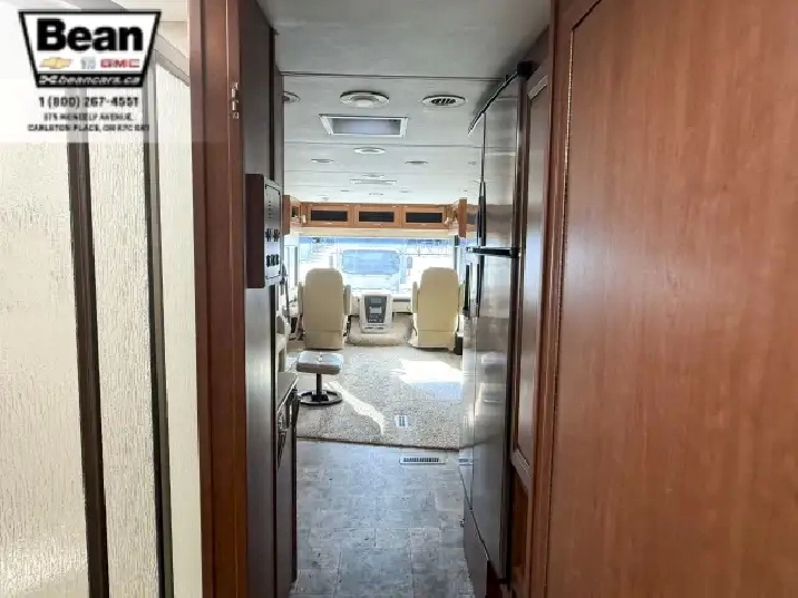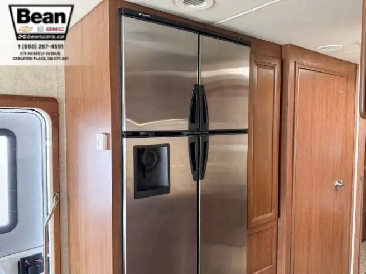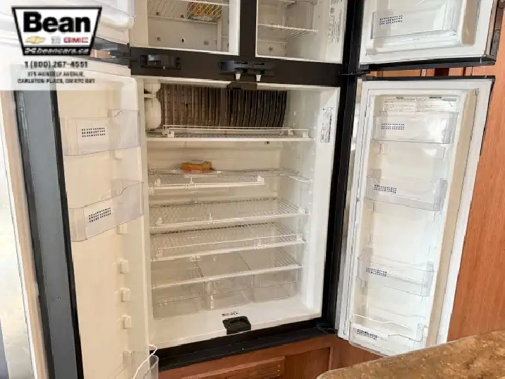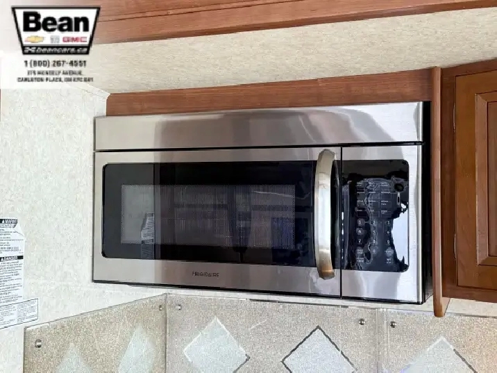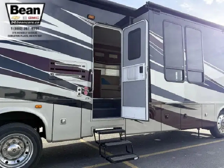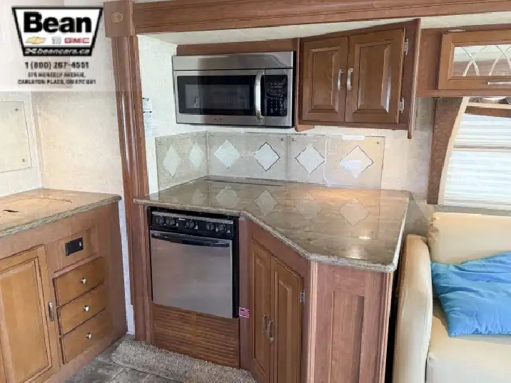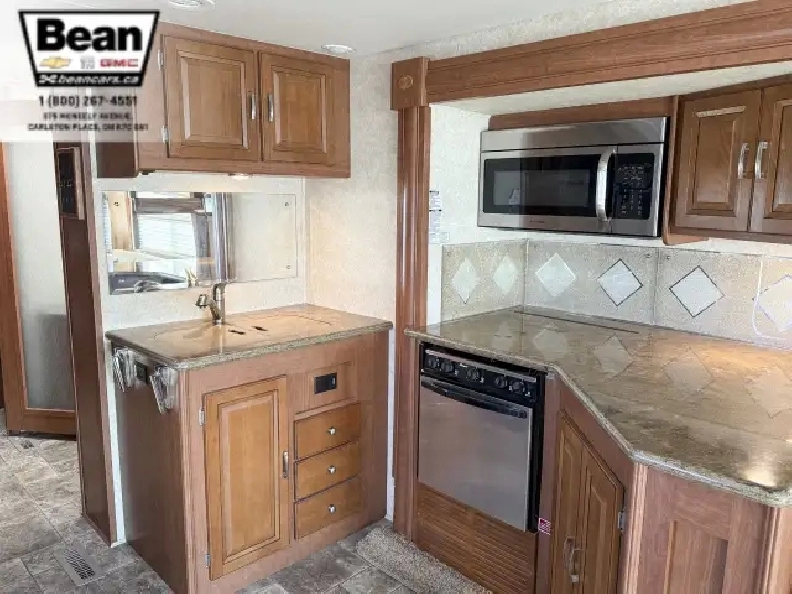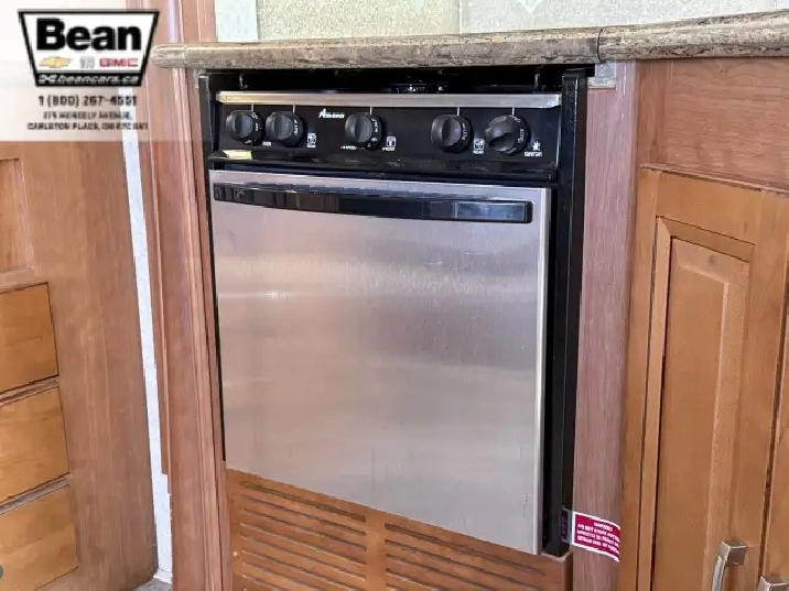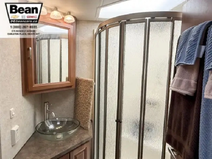 The kitchen is a dream for travelers who love to cookit features solid-surface countertops, stainless-steel appliances, a three-burner stove with flush covers, oven, microwave, and a large 4-door refrigerator, plus tons of cabinet space and a handy countertop extension. The bathroom offers a stand-up shower with skylight, a separate toilet, and a bathroom vanity with storage, while the rear bedroom provides a private retreat with a queen bed, ample storage, and its own TV. Outside, the power awning offers shade, and features like automatic hydraulic leveling jacks, electric entrance steps, a rear-vision camera, and a 5,000-lb hitch make for safe, easy setup and confidence on the road.
