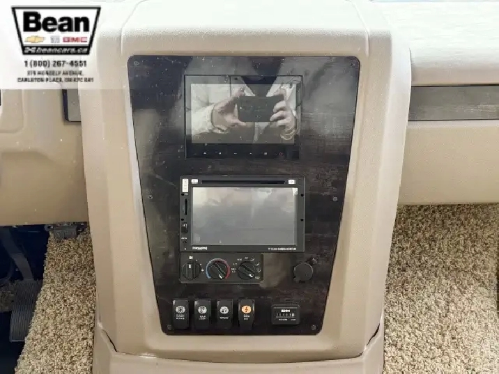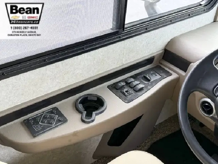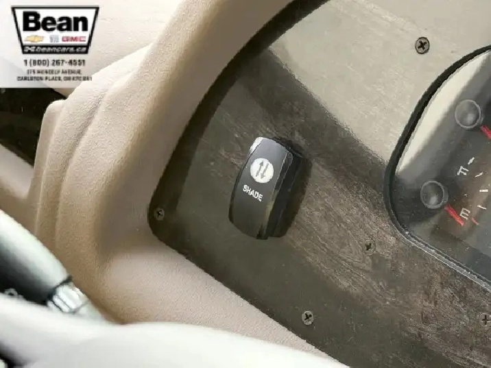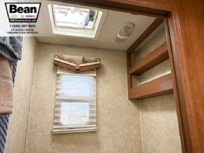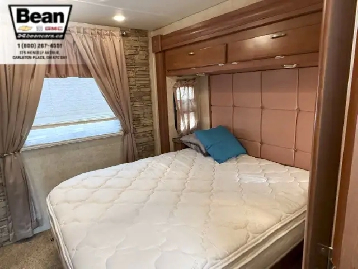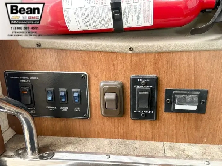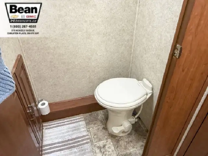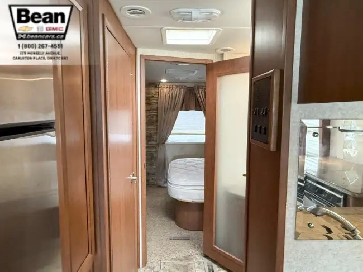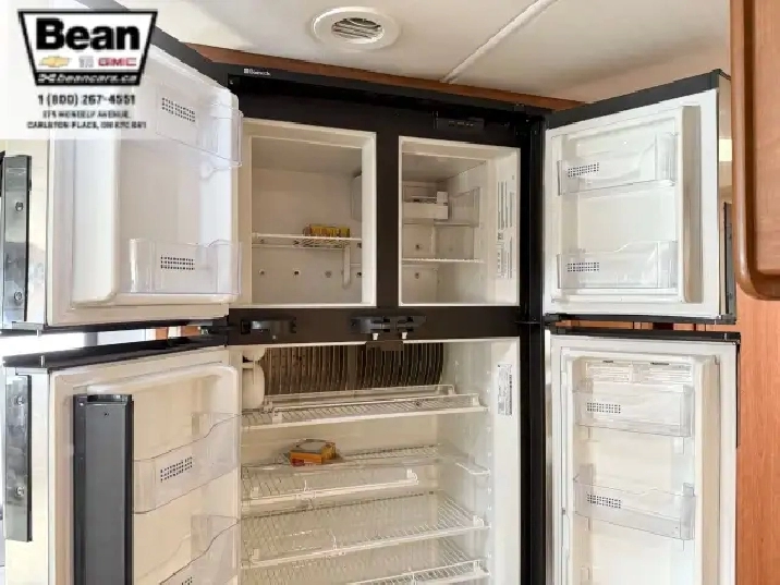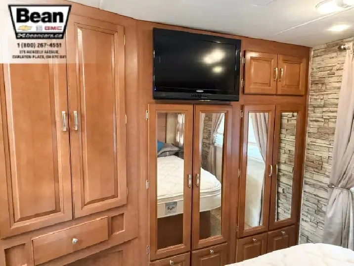 The kitchen is a dream for travelers who love to cookit features solid-surface countertops, stainless-steel appliances, a three-burner stove with flush covers, oven, microwave, and a large 4-door refrigerator, plus tons of cabinet space and a handy countertop extension. The bathroom offers a stand-up shower with skylight, a separate toilet, and a bathroom vanity with storage, while the rear bedroom provides a private retreat with a queen bed, ample storage, and its own TV. Outside, the power awning offers shade, and features like automatic hydraulic leveling jacks, electric entrance steps, a rear-vision camera, and a 5,000-lb hitch make for safe, easy setup and confidence on the road.