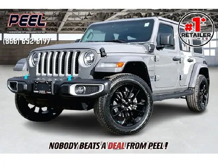 2023 Jeep Wrangler Sahara 4XE | 2.0L PHEV Engine | Sting Grey | Heated Leather Bucket Seats | Uconnect 8.4 Touchscreen Display w/ Navigation | Apple CarPlay & Android Auto | Alpine Premium Audio System | Heated Steering Wheel | Remote Start | LED Lighting Group | Body Colour 3-piece Hard Top | Body Colour Fenders | 4:1 Rock-Trac Full-time 4WD System | Remote Proximity Keyless Entry | Side Steps