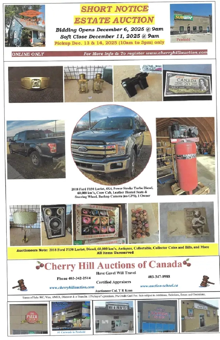 AT THE AUCTION Opens Dec. 6/25 9am soft close Dec. 11/25 9am LIKE NEW ONE OWNER 2018 F150 4X4 LARIAT Deisel 60,000 KL for more inf. and to REGISTER www.cherryhillauction.com 403 347-8988 or 403 342-2514