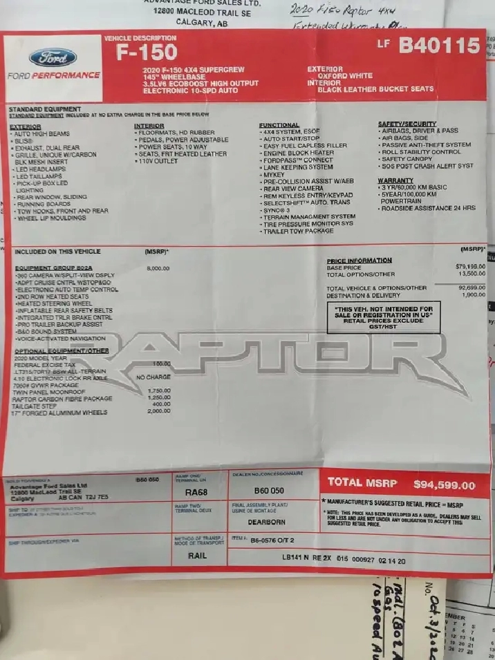 3.5 litre ecoboost, fully loaded with leather, heated and cooled front seats (heated rear seats), moonroof, sliding rear window. Oem tires replaced at 60,000 kms w/ BFG all terrain k02’s.