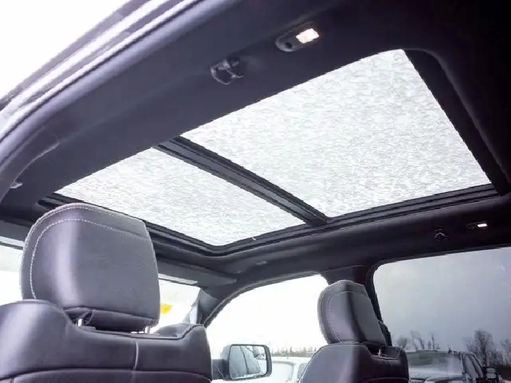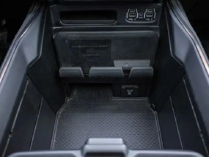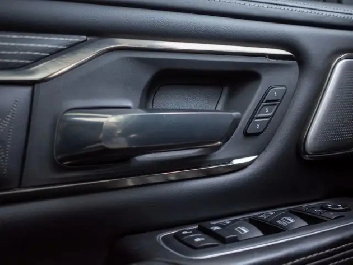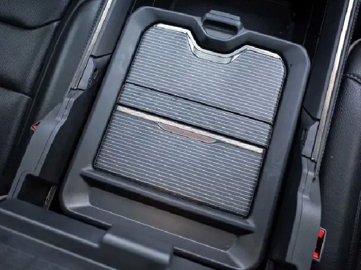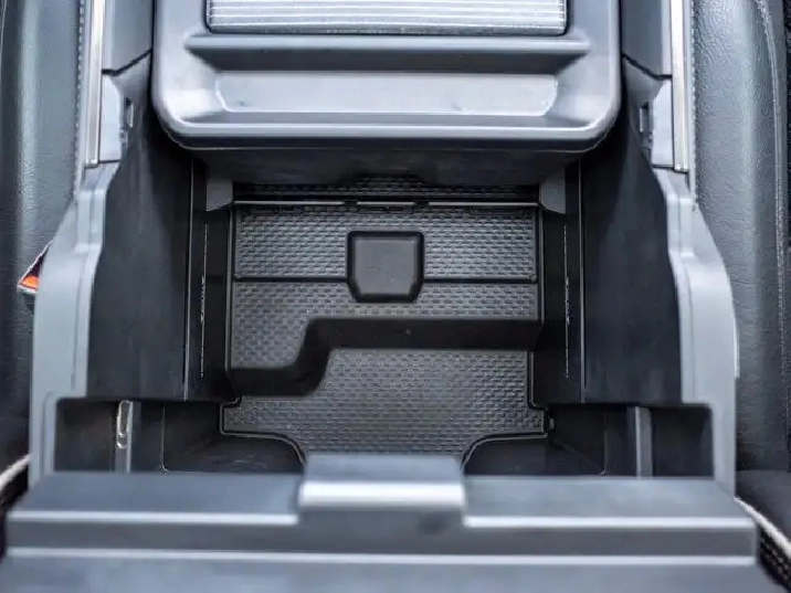 Technology features include a large touchscreen infotainment system with navigation, smartphone integration, a premium audio system, wireless charging pad, power-deployable running boards, and rear under-seat storage for added utility.