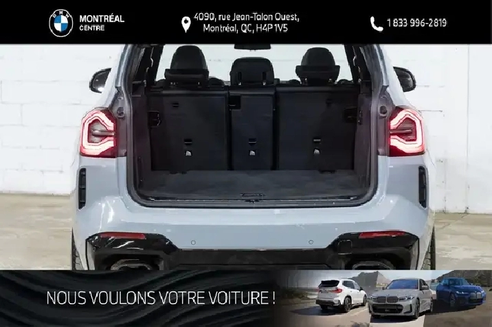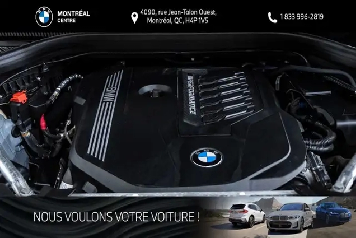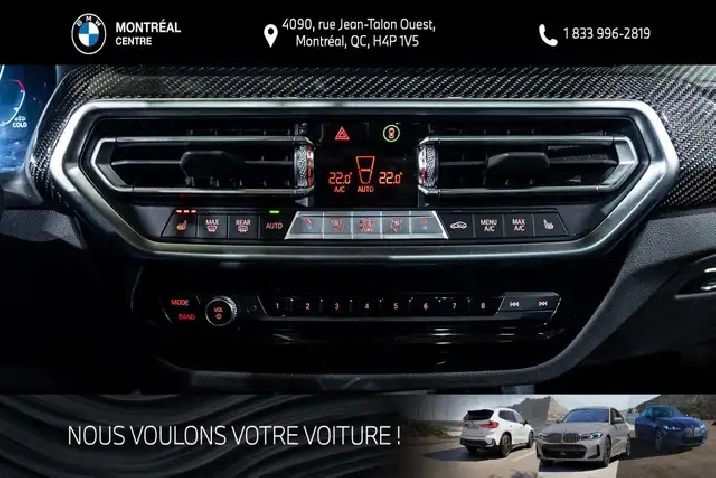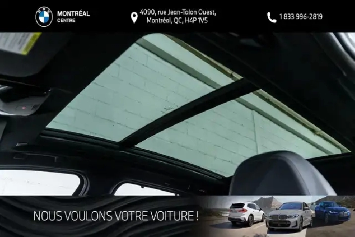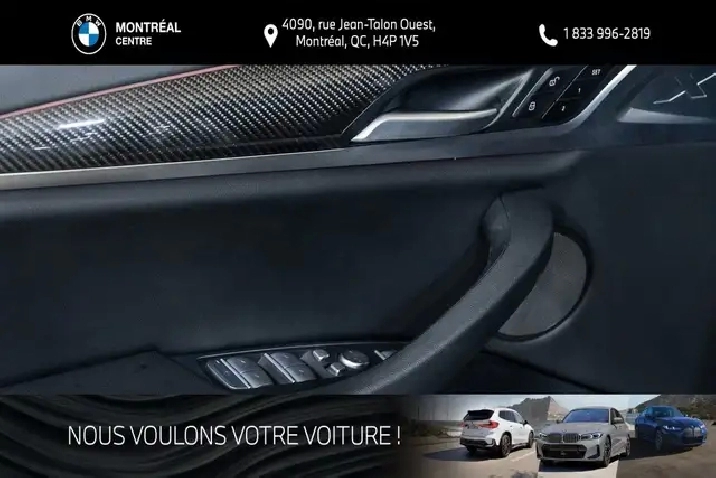 Les taxes de vente, les frais de transport et de préparation ainsi que les frais administratifs et d'immatriculation ne sont pas inclus dans le prix affiché. Vous avez des questions? Appelez / Textez au 514-731-7871 ou envoyez-nous un courriel ? [email protected]. Située au 4090, rue Jean-Talon Ouest ? Montréal (QC), BMW Montréal Centre sert la clientèle de la grande région de Montréal depuis 1970 en offrant un vaste inventaire de véhicules neufs et certifiés d'occasion, ainsi que des services complets de ventes, d'entretien, de réparations et de pièces.