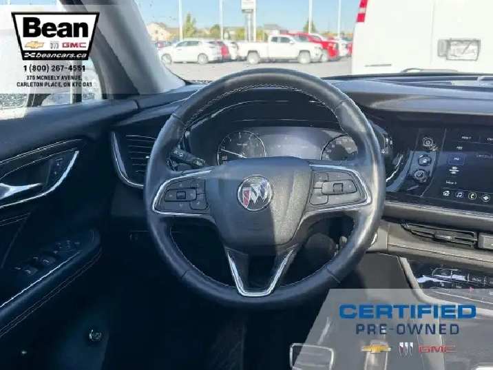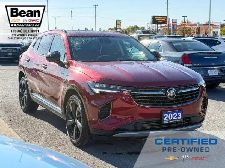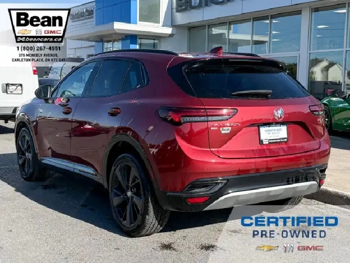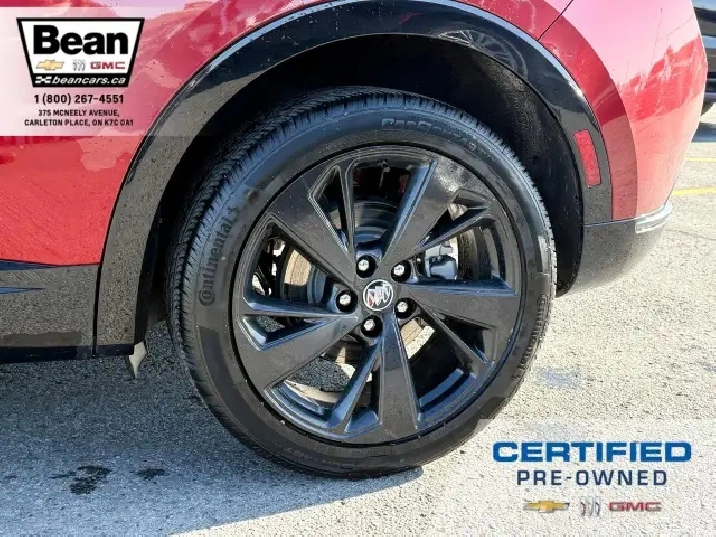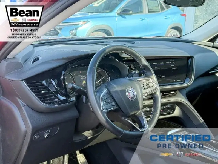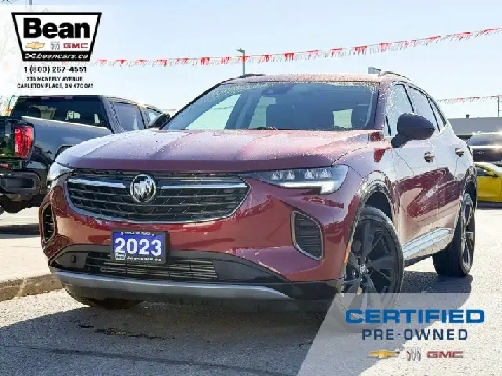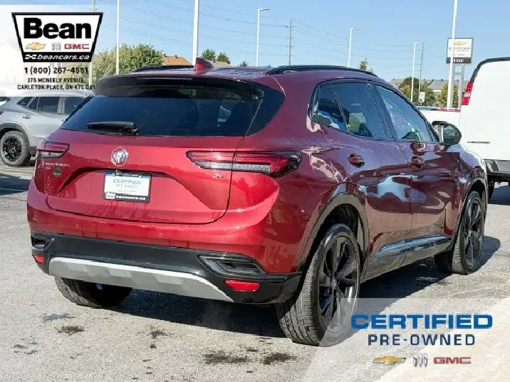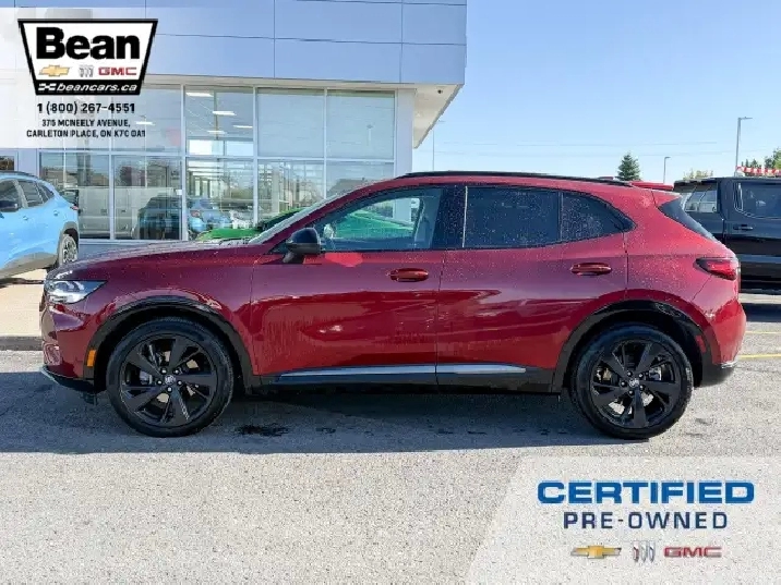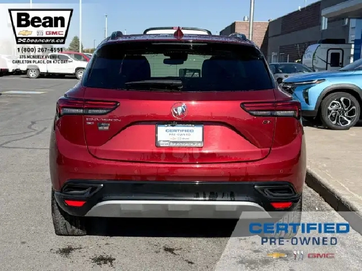 WOW! This Envision is super sharp with its Cinnabar Metallic exterior colour that will be sure to turn some heads! This SUV is a local one owner trade that was originally purchased at our dealership and was always maintained in our service department and for an added peace of mind it also has a clean Carfax! It is the Preferred trim level with added Sport Touring package that will be sure to add some pizazz to this ride and also has the Buick Driver Confidence, Comfort and Convenience and the Envision Driver Confidence packages that makes this Envision not just great looking but comfortable and safe at the same time! The Sport Touring Package includes a custom front grille, body coloured door handles, black roof rails, dark gloss finish mouldings and wheel arches, 20 dark finish alloy wheels, flat bottomed heated leather wrapped steering wheel and ST badging on the exterior and etched into the front head rests. The Buick Driver Confidence Package includes front pedestrian braking, lane keep assist with lane departure warning, forward collision alert, automatic emergency braking, following distance indicator and Intellibeam headlamps. The Envision Driver Confidence Package includes lane change alert with side blind zone alert and rear cross traffic alert. The last package is the Comfort and Convenience that has a hands free power liftgate, heated steering wheel, heated driver and passenger seats, remote vehicle start, dual zone climate control, 10.2 diagonal Buick infotainment system, 7 speaker enhanced audio system with amplifier, air quality indicator and automatic air quality indicator. This Envision has it all and is ready for its new home!
