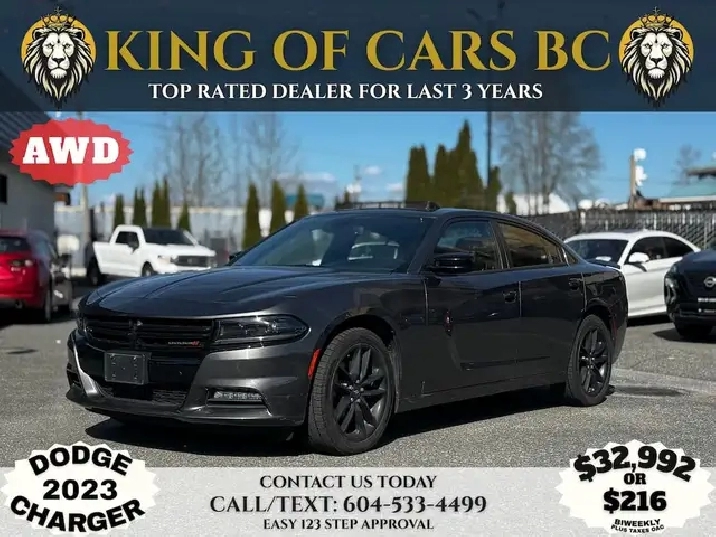 2023 DODGE CHARGER SXT Stock Number: P215855 VEHICLE OPTIONS AWD, LED Headlights, Spoiler, Alloys, 5 Passenger Seating, Remote Starter, Keyless Go, Push Start,Panoramic Glass Roof , Digital Driver Display, Navigation, Backup Camera, Apple CarPlay, Android Auto, Leather Seats, Power Seats, Memory Seats, Heated Seats, Cooled Seats, Heated Steering Wheel, Alpine Speakers, Automatic Emergency Braking, Adaptive Cruise Control, Lane Assist, Blind Spot Detection, Paddle Shifters, Bluetooth, Heated side mirrors, Mirror Dimming, Available warranty options Call or Text: 604-533-4499 Apply Online: kingofcarsbc.com Dealer #31301 Plus an administration fee of $895, finance fee of $995 and Applicable Taxes All finance options are subject to OAC (On Approved Credit)