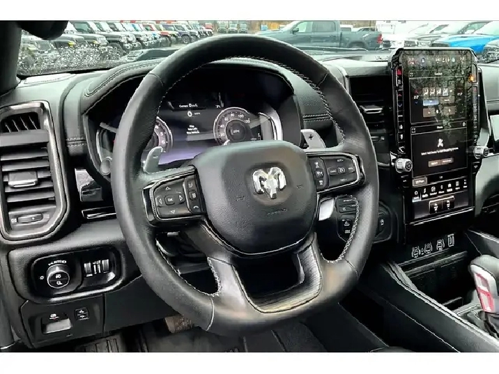 A next-generation Rebel that completely rewrites what a Ram should feel like, this 2025 Ram 1500 Rebel X in Diamond Black Crystal Pearl is built around the new 3.0L Hurricane twin turbo inline-6 pushing up to 420 hp and 469 lb-ft of torque, delivering stronger, smoother power than the outgoing HEMI with effortless acceleration and serious towing confidence. Inside is where this truck separates itself, loaded with premium leather bucket seats, heated and ventilated front seats, heated rear seats, a heated steering wheel, and a dual-pane panoramic sunroof, all centred around the massive 14.4-inch Uconnect touchscreen with navigation, plus a front passenger interactive display and dual wireless charging pads that make it feel more like a luxury SUV than a pickup. The 19-speaker Harman Kardon system takes it to another level, while wireless Apple CarPlay and Android Auto keep everything seamless. Safety and driver tech are fully dialled in with Adaptive Cruise Control, Lane Keep Assist, Forward Collision Warning, and Park-Sense sensors, making daily driving and highway cruising effortless. On the functional side, the power tailgate, rear power sliding window, spray-in bedliner, and Class IV hitch keep it ready for real truck use, while TRX off-road running boards, the special edition console badge, and the flat-bottom leather steering wheel with paddle shifters add a performance-inspired edge. This Rebel X is the top-tier spec buyers are chasing, delivering cutting-edge power, serious tech, and standout presence in one fully loaded package.