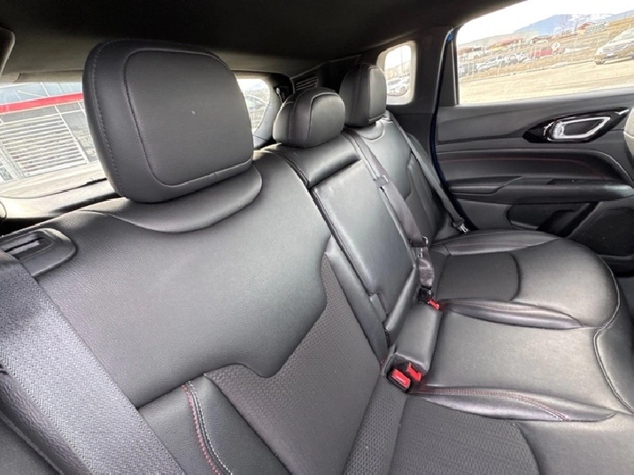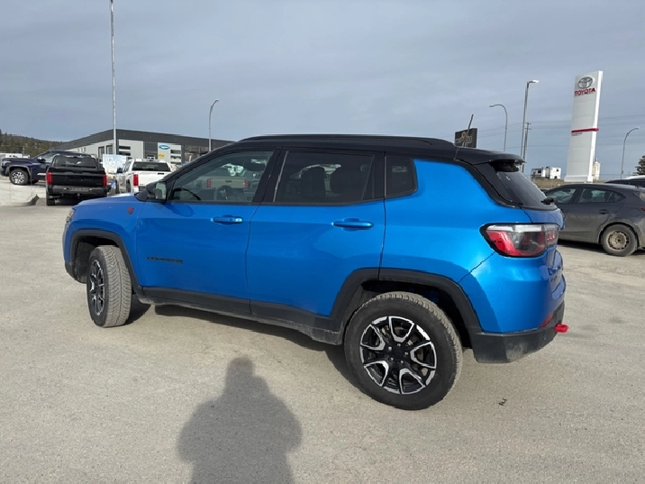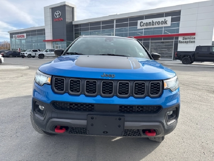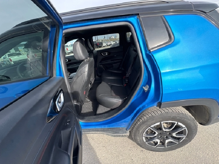 Our Compass's trim level is Trailhawk. This rugged Compass Trailhawk comes prepped with a comprehensive off-road package that includes beefy suspension, 4 skid plates for undercarriage protection and black aluminum wheels with a full-size under-cargo mounted spare, along with front fog lamps, LED headlights with automatic high beams and cornering function, roof rack rails, and front and rear bumper tow hooks. The standard features continue with heated and power-adjustable front seats with driver lumbar support, a heated steering wheel, cloth/leather seating upholstery, remote engine start, proximity keyless entry, dual-zone front automatic air conditioning, and a 10.1-inch infotainment screen with Apple CarPlay and Android Auto. Safety features also include blind spot detection, forward collision warning with active braking and rear cross-path detection, lane keeping assist with lane departure warning, rear parking sensors, and a rearview camera. This vehicle has been upgraded with the following features: Off-Road Package, Blind Spot Detection, Leather Seats, 4G Wi-Fi, Heated Steering Wheel, Remote Start, Proximity Key.