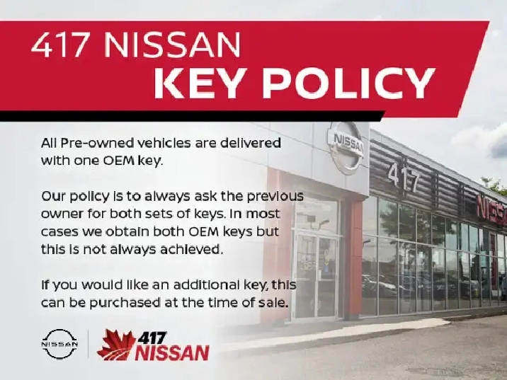 417 Nissan offer no hassle buying experience. We check and adjust our prices daily to make sure that our vehicles are priced to the market. Free Carfax report with every vehicle purchase. We are proud to regularly serve our clients and ready to help you find the right car that fits your needs, your wants, and your budget. And, of course, we're always happy to answer any of your questions. Proudly supporting Ottawa, Orleans, Vanier, Barrhaven, Kanata, Nepean, Stittsville, Carp, Dunrobin, Kemptville, Westboro, Cumberland, Rockland. Call us at (613) 749-9417 or use the Get More Info button for more information. Please see dealer for details. Vehicle may not be exactly as shown. Cash price advertised, taxes & licensing are extra. OMVIC licensed.