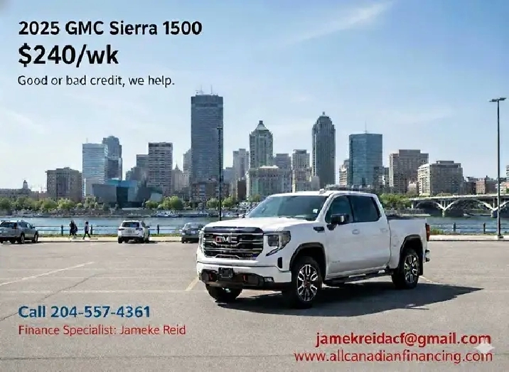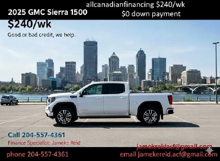 2025 GMC Sierra 1500 $240/wk$0 Down PaymentGood or Bad Credit$$$ for refferals Free Canada wide Delivery Fiance SpecialistJameke Reid Phone 204-557-4361 Email [email protected] Www.allcanadianfinancing.com