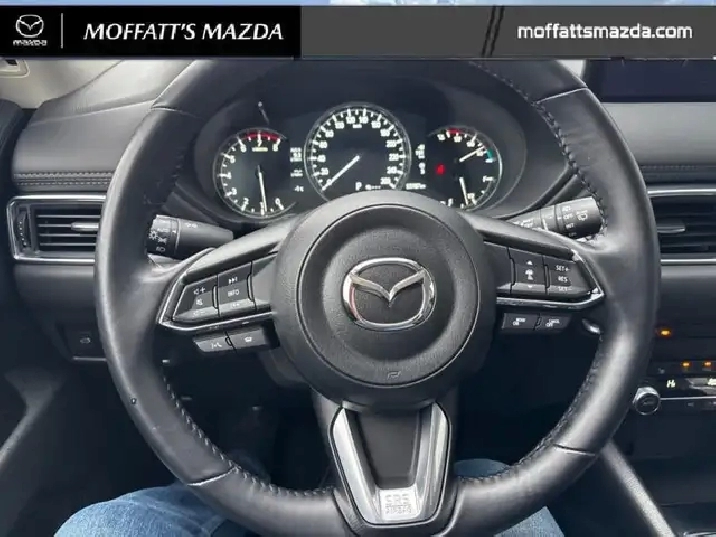 Our CX-5's trim level is GS. Standard features include a power liftgate for rear cargo access, heated front seats with a heated steering wheel, dual-zone climate control, adaptive cruise control, smart device remote engine start, automatic high beams, and a 10.25-inch infotainment screen with Apple CarPlay and Android Auto. Safety features also include lane keep assist with lane departure warning, collision mitigation, and advanced bins spot monitoring.