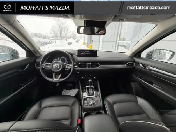 Our CX-5's trim level is GS. Standard features include a power liftgate for rear cargo access, heated front seats with a heated steering wheel, dual-zone climate control, adaptive cruise control, smart device remote engine start, automatic high beams, and a 10.25-inch infotainment screen with Apple CarPlay and Android Auto. Safety features also include lane keep assist with lane departure warning, collision mitigation, and advanced bins spot monitoring.