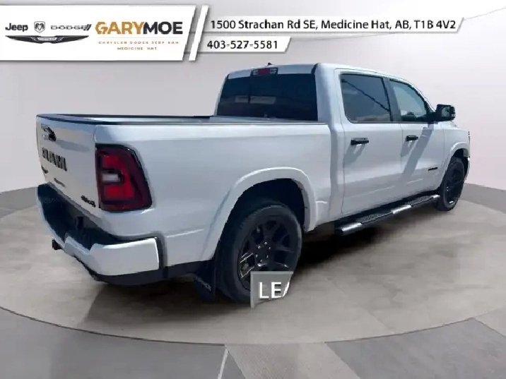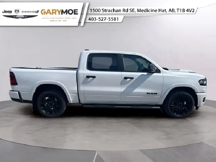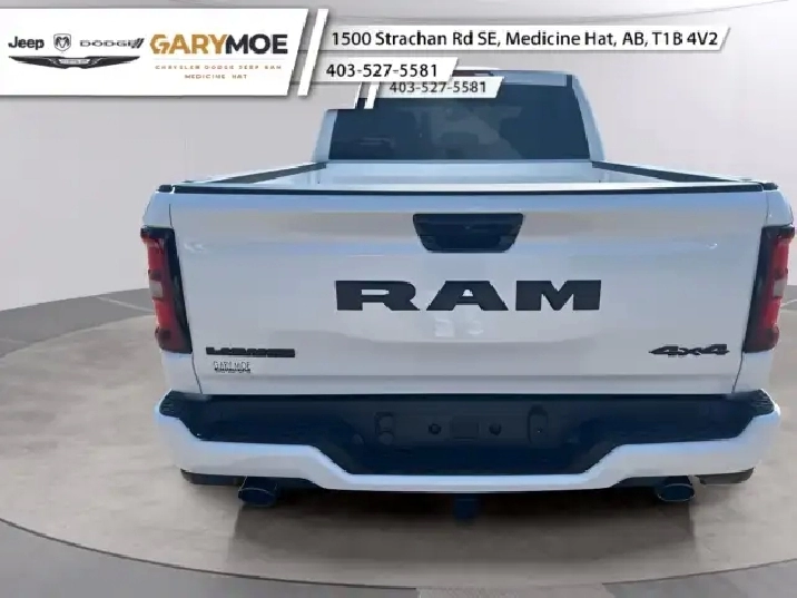 The 2025 Ram 1500 Laramie, dressed in a pristine white, features a robust 4x4 drivetrain that masters both city streets and rugged terrains with ease. This truck offers a harmonious blend of rugged exterior design and sophisticated styling, emphasizing its dual nature as both a hard-working vehicle and a refined driving machine.