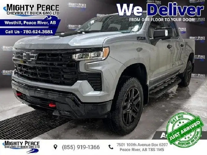 Off-Road Package, Heated Seats, Heated Steering Wheel, Remote Start, Climate Control, Trailering Package, Aluminum Wheels, Remote Start, Automatic Emergency Braking, Lane Keep Assist, Lane Departure Warning, Forward Collision Alert Your GM King of the North since 1969! We Deliver! From Our Floor to Your Door! Reliable, adaptable and ready for action, the 2026 Silverado 1500 is your partner in work and adventure. The 2026 Chevrolet Silverado 1500 delivers full-size pickup performance with a polished interior and smart technology to meet the demands of both work and play. Inside you’ll find an interior designed for comfort and connectivity, outfitted with modern amenities and a layout that supports both productivity and leisure. With such versatility, the Silverado 1500 stands ready to take on the tough jobs and the long drives in equal fashion. This silver crew cab 4X4 pickup has an automatic transmission and is powered by a 355HP 5.3L 8 Cylinder Engine. Driven via that powerful motor it gets 13.7 L/100 km in the city and 11.8 L/100 km out on the highway according to Transport Canada. Our Silverado 1500's trim level is LT Trail Boss. This trim steps things up with off-road equipment including uprated shocks, skid plates and a heavy duty air filter, heated front seats, a heated steering wheel and dual-zone climate control, along with a trailering package, remote start, aluminum wheels, hitch guidance, a power locking EZ lift tailgate, and an upgraded 13.4-inch infotainment display with navigation capability, Apple CarPlay and Android Auto. Safety features also include lane keep assist with lane departure warning, following distance indication, forward collision alert, and automatic emergency braking with front pedestrian braking. To apply right now for financing use this link : https://www.mightypeacegm.ca/finance-application/ Total rebate of $5000 is reflected in the price. Incentives expire 2025-12-01. See dealer for details. Our AMVIC licensed business is conveniently located at 7501 100th Avenue in Peace River, AB, and we feature a wide array of models to choose from. At Mighty Peace Chevrolet Buick GMC Ltd., not only do we offer a wide selection of new vehicles to choose from, we also provide our customers with a GM Certified service and repair center. Book your test drive with one of our knowledgeable sales staff by calling (780) 624-3681. Vehicle pricing offer shown expire 2025-11-30. Come by and check out our fleet of 50 used cars and trucks and 110 new cars and trucks for sale in Peace River. o~o