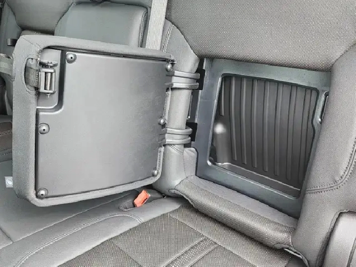 • Seat, Up-level Rear with Storage Package 60/40 folding bench for Crew Cab models, includes full-length bench seat, seatback storage on left and right side, centre fold out armrest with 2 cupholders, full cab width underseat storage, (includes child seat top tether anchor) (Rear seat features leather seating surfaces.)