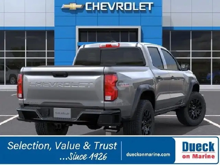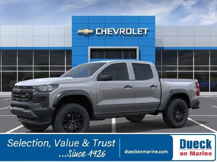 Tough and trail-ready, the 2026 Chevrolet Colorado Trail Boss Crew Cab 4X4 in Sterling Gray Metallic brings fearless capability to off-road adventures. Powered by a 2.7L TurboMax supplying 310hp to an 8 Speed Automatic transmission. You're ready to cruise over off-road obstacles with a 2-inch factory lift, 2-speed transfer case, and auto-locking rear differential, and this Four Wheel Drive truck achieves approximately 11.2L/100km on the highway. Our Colorado's exterior is enhanced by gloss-black alloy wheels, prominent fender flares, black mirror caps, matching beltline moldings, a remote-locking tailgate, and a rear CornerStep bumper. It looks good getting dirty, too!Adventure-ready, our Trail Boss cabin features cloth seating, a functional wrapped steering wheel, automatic climate control, keyless access with pushbutton start, and a 12V outlet. A high-tech digital dash adds an 11.3-inch touchscreen and 11-inch driver display with Google Built-In, wireless Apple CarPlay®/Android Auto®, Bluetooth®, WiFi compatibility, and a six-speaker audio system for everyday connectivity.Chevrolet takes an intelligent approach to safety by equipping this truck with automatic braking, hill descent control, hill start assistance, lane-keeping assistance, pedestrian/cyclist detection, forward collision warning, an HD rearview camera, and more. Engineered for overachievers, our Colorado Trail Boss is ready to go! Save this Page and Call for Availability. We Know You Will Enjoy Your Dueck on Marine Test Drive Towards Ownership! Dueck on Marine is located at 400 S.E. Marine Drive in Vancouver BC. We look forward to helping you trade-in your old car or SUV, helping you find your next new or used vehicle and then helping you complete the purchase with the financing and purchase option that is best for you. Dealer #8430. Taxes and $699 Administration fee excluded in prices.While every reasonable effort has been made to ensure the accuracy of the details and pricing on this website, errors may occur. Please contact the dealership to confirm all information and pricing.