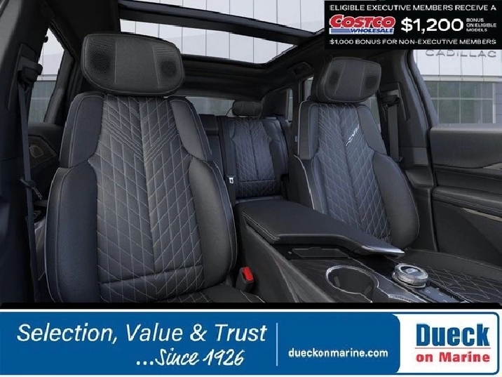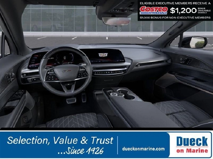 Our hard-to-find 2026 Cadillac LYRIQ-V Premium AWD in Stellar Black Metallic radiates electrified elegance with groundbreaking all-wheel drive performance, futuristic design, and zero-emission luxury that redefines what it means to drive electric. Powered by Dual Electric Motors providing a combined 615hp to a Single Speed Automatic transmission for fierce acceleration. Tuned for dynamic handling, this All Wheel Drive SUV also features a 102kWh Ultium battery pack for nearly 450 kilometers of anxiety-free EV travel. Our LYRIQ-Vs have Velicity Max with launch Control to send you to 60mph in 3.3 seconds, plus they show LED lighting that delivers a choreographed welcome sequence as you approach. It's a fantastic sight that complements a fixed-glass roof, Brembo braking, continuous damping suspension, 22-inch reverse rim wheels, a power liftgate, and Charge Network Access.Move to our V-Series Premium cabin to discover heated Nappa power front seats, a reclining second row, a heated power steering wheel, dual-zone automatic climate control, and ambient lighting. A 33-inch digital dashboard is command central with touchscreen control, Google built-in, wireless Android Auto®/Apple CarPlay®, Bluetooth®, wireless charging, WiFi compatibility, and a seven-speaker sound system. It's an eye-catching interior that treats you right!Cadillac engineers this machine for safer journeys with smart driver assistance, including enhanced automatic braking, adaptive Super Cruise control, blind-spot intervention, head-up display, lane-keeping assistance, HD surround vision, automatic parking assistance, and more. A sophisticated utility vehicle, our LYRIQ-V Premium moves you in masterful harmony! Save this Page and Call for Availability. We Know You Will Enjoy Your Test Drive Toward Ownership! Dueck on Marine is located at 400 S.E. Marine Drive in Vancouver BC. We look forward to helping you trade-in your old car or SUV, helping you find your next new or used vehicle and then helping you complete the purchase with the financing and purchase option that is best for you. Dealer #8430. Taxes and $795 Administration fee excluded in prices.While every reasonable effort has been made to ensure the accuracy of the details and pricing on this website, errors may occur. Please contact the dealership to confirm all information and pricing.