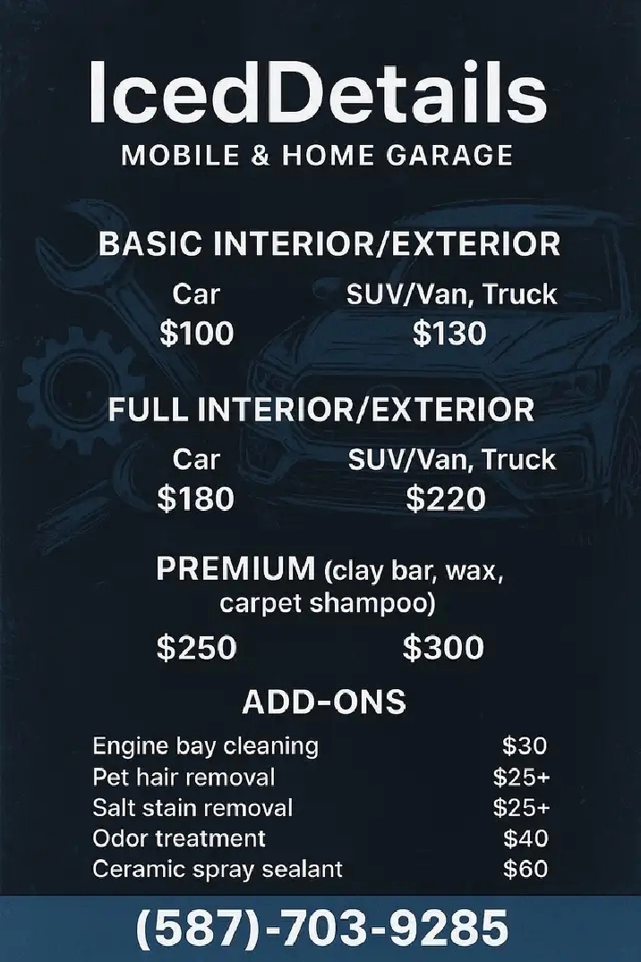 Mobile we come to you!Calgary/Airdrie/Langdon/StrathmoreInterior / Exterior Detailing Winter interior maintenance available Call or text 587-703-9285