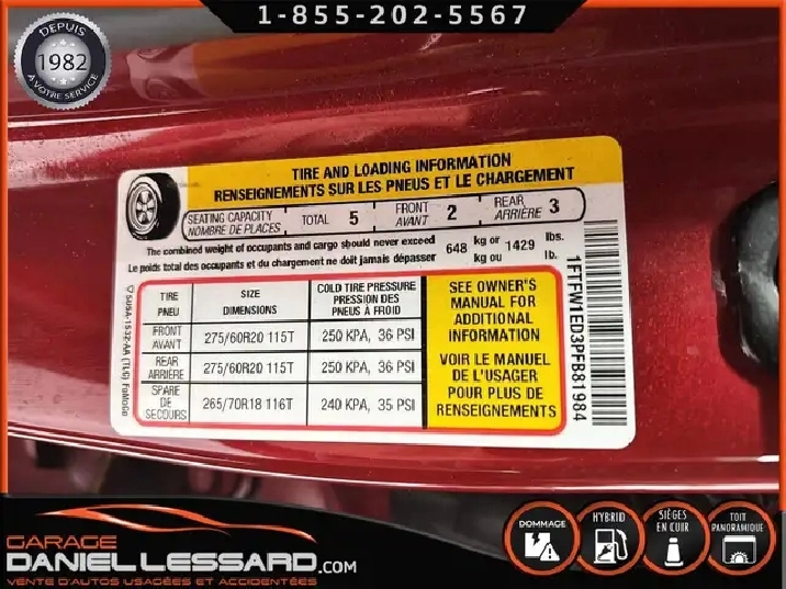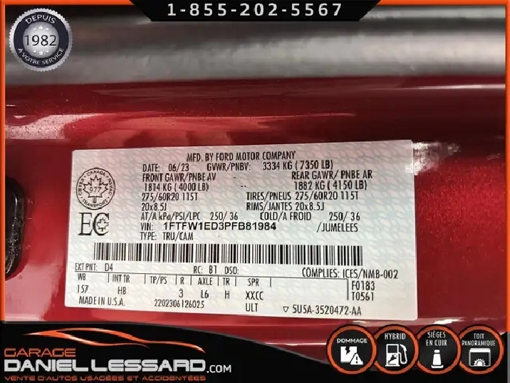 LARIAT POWERBOOST 3.5L RATIO 3.73, CREW CAB, BTE 6.5, CAMION ACCIDENTÉ VGA POUR BEAUCOUP PLUS DE PHOTOS ET DÉTAILS DIRECTEMENT SUR NOTRE SITE INTERNET OFFICIEL AU WWW.DANIELLESSARD.COM, VOIR ÉGALEMENT VIDÉO DISPONIBLE DANS L'ANNONCE ! 2023 FORD F150 LARIAT CREW CAB POWERBOOST 3,5 LITRES AVEC BTE DE 6.5 MOTEUR V6 DE 3.5 LITRES POWERBOOST, 147309 KM CAMION TRÈS BIEN ÉQUIPÉ, TOIT PANORAMIQUE, SIÈGES EN CUIR VENTILÉ, SIÈGE CHAUFFANT À L'AVANT ET À L'ARRIÈRE, SIÈGE MÉMOIRE POUR LE CONDUCTEUR, VOLANT AJUSTABLE ÉLECTRIQUE, PÉDALE AJUSTABLE ÉLECTRIQUE, MARCHE PIED FIXE, ENSEMBLE REMORQUAGE AVEC AIDE AU RECUL ET BOITIER D FREIN INTÉGRÉ DE CIE, SYSTÈME DE NAVIGATION, RECHARGE SANS FILS POUR APPAREIL COMPATIBLE, CRUISE CONTROL ADAPTATIF, DÉTECTEUR ANGLE MORT, ANTICOLLISION, DÉTECTEUR DE VOIE, TAPIS MOULÉE, BLUETOOTH, GROUPE ÉLECTRIQUE, COMMANDE AUDIO SUR LE VOLANT, SYSTÈME AUDIO B&O, PRISE DE COURANT DANS LA BOITE, 2 CLÉ AVEC DÉMARREUR INTÉGRÉ, MONTÉ SUR MAG 22 POUCES FUEL AVEC PNEUS TOYO OPEN COUNTRY A/T HOMOLOGUÉ EN 275-50-22 CAMION ACCIDENTÉ À VOIR VÉHICULE VGA ACCIDENTÉ, BALLON OK, CEINTURES OK, SUSPENSION OK MÉCANIQUE OK WOW UNE VRAI BELLE JOB A FAIRE POUR LES RÉPARATIONS : REDRESSEMENT DES2 SECTION DE FRAME ARRIÈRE OU LEUR REMPLACEMENT, PARE CHOC ARRIÈRE ASSEMBLER AVEC PLATE GUIDE, LE TAIL GATE, RÉPARATION OU REMPLACEMENT DU COTÉ DE BOITE GAUCHE, REPARATION DU VALENCE DE PARE CHOC AVANT, TOUJOURS RESPECTER LES NORMES DE VOTRE PROVINCE POUR LES RÉPARATIONS CONTACTEZ L'UN DE NOS CONSEILLERS QUALIFIÉS POUR PLUS DE DÉTAILS ! PLUSIEURS VÉHICULES DE TOUTES MARQUES DISPONIBLES AU WWW.DANIELLESSARD.COM, LA PLACE POUR MAGASINER VOTRE VÉHICULE JAMAIS ACCIDENTÉ, RÉPARÉ OU ENDOMMAGÉ. PLUS DE 100 VÉHICULES DISPONIBLES. ARRIVAGES QUOTIDIENS !!! FINANCEMENT ET GARANTIE PROLONGÉE DISPONIBLES ! NOUS REPRENONS LES ÉCHANGES. NOUS AVONS UN LARGE RÉSEAU DE CARROSSIERS EXPERTS À VOTRE DISPOSITION POUR VOTRE SERVICE DE RÉPARATION CLÉ EN MAIN. NOS VÉHICULES PRÊTS À PARTIR SONT INSPECTÉS AU COMPLET PAR NOUS ET LA SAAQ, VENDUS AVEC GARANTIE. NOUS SOMMES OUVERTS DU LUNDI AU VENDREDI 8:00 À 17:00 ET LE SAMEDI AU 9:00 À 12:00. VISITEZ NOTRE PAGE FACEBOOK ! AU PLAISIR DE VOUS RENCONTRER. À VOTRE SERVICE DEPUIS 1982 POUR BEAUCOUP PLUS DE PHOTOS ET DÉTAILS DIRECTEMENT SUR NOTRE SITE INTERNET OFFICIEL AU WWW.DANIELLESSARD.COM, VOIR ÉGALEMENT VIDÉO DISPONIBLE DANS L'ANNONCE ! 2023 FORD F150 LARIAT CREW CAB POWERBOOST 3,5 LITRES AVEC BTE DE 6.5 MOTEUR V6 DE 3.5 LITRES POWERBOOST, 147309 KM CAMION TRÈS BIEN ÉQUIPÉ, TOIT PANORAMIQUE, SIÈGES EN CUIR VENTILÉ, SIÈGE CHAUFFANT À L'AVANT ET À L'ARRIÈRE, SIÈGE MÉMOIRE POUR LE CONDUCTEUR, VOLANT AJUSTABLE ÉLECTRIQUE, PÉDALE AJUSTABLE ÉLECTRIQUE, MARCHE PIED FIXE, ENSEMBLE REMORQUAGE AVEC AIDE AU RECUL ET BOITIER D FREIN INTÉGRÉ DE CIE, SYSTÈME DE NAVIGATION, RECHARGE SANS FILS POUR APPAREIL COMPATIBLE, CRUISE CONTROL ADAPTATIF, DÉTECTEUR ANGLE MORT, ANTICOLLISION, DÉTECTEUR DE VOIE, TAPIS MOULÉE, BLUETOOTH, GROUPE ÉLECTRIQUE, COMMANDE AUDIO SUR LE VOLANT, SYSTÈME AUDIO B&O, PRISE DE COURANT DANS LA BOITE, 2 CLÉ AVEC DÉMARREUR INTÉGRÉ, MONTÉ SUR MAG 22 POUCES FUEL AVEC PNEUS TOYO OPEN COUNTRY A/T HOMOLOGUÉ EN 275-50-22 CAMION ACCIDENTÉ À VOIR VÉHICULE VGA ACCIDENTÉ, BALLON OK, CEINTURES OK, SUSPENSION OK MÉCANIQUE OK WOW UNE VRAI BELLE JOB A FAIRE POUR LES RÉPARATIONS : REDRESSEMENT DES2 SECTION DE FRAME ARRIÈRE OU LEUR REMPLACEMENT, PARE CHOC ARRIÈRE ASSEMBLER AVEC PLATE GUIDE, LE TAIL GATE, RÉPARATION OU REMPLACEMENT DU COTÉ DE BOITE GAUCHE, TOUJOURS RESPECTER LES NORMES DE VOTRE PROVINCE POUR LES RÉPARATIONS CONTACTEZ L'UN DE NOS CONSEILLERS QUALIFIÉS POUR PLUS DE DÉTAILS ! PLUSIEURS VÉHICULES DE TOUTES MARQUES DISPONIBLES AU WWW.DANIELLESSARD.COM, LA PLACE POUR MAGASINER VOTRE VÉHICULE JAMAIS ACCIDENTÉ, RÉPARÉ OU ENDOMMAGÉ. PLUS DE 100 VÉHICULES DISPONIBLES. ARRIVAGES QUOTIDIENS !!! FINANCEMENT ET GARANTIE PROLONGÉE DISPONIBLES ! NOUS REPRENONS LES ÉCHANGES. NOUS AVONS UN LARGE RÉSEAU DE CARROSSIERS EXPERTS À VOTRE DISPOSITION POUR VOTRE SERVICE DE RÉPARATION CLÉ EN MAIN. NOS VÉHICULES PRÊTS À PARTIR SONT INSPECTÉS AU COMPLET PAR NOUS ET LA SAAQ, VENDUS AVEC GARANTIE. NOUS SOMMES OUVERTS DU LUNDI AU VENDREDI 8:00 À 17:00 ET LE SAMEDI AU 9:00 À 12:00. VISITEZ NOTRE PAGE FACEBOOK ! AU PLAISIR DE VOUS RENCONTRER. À VOTRE SERVICE DEPUIS 1982