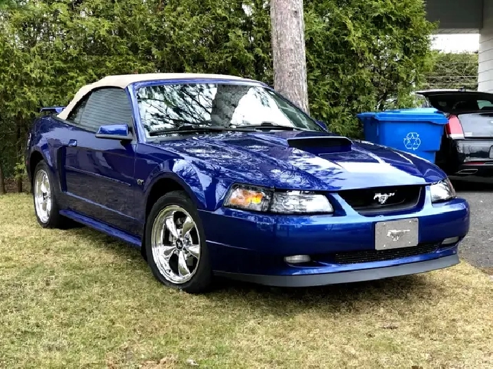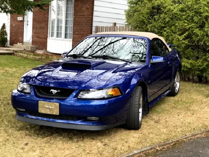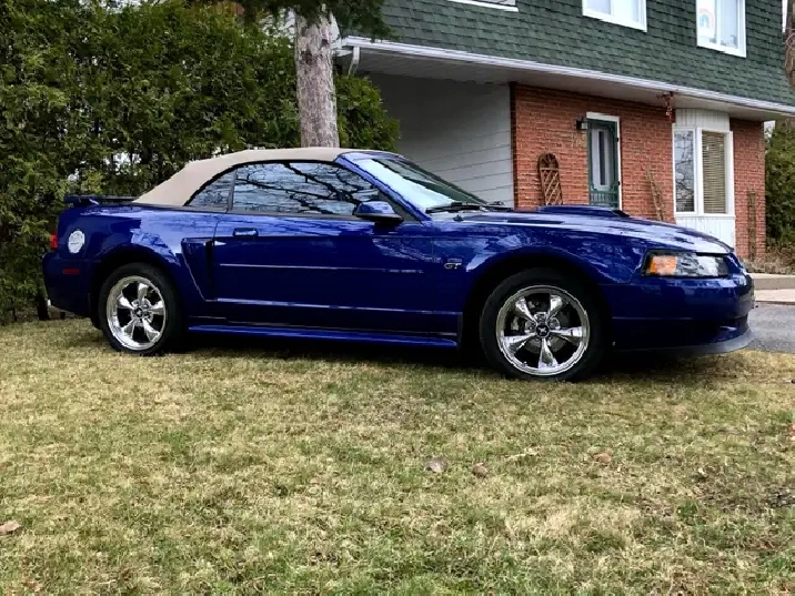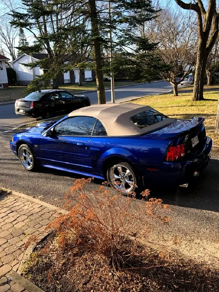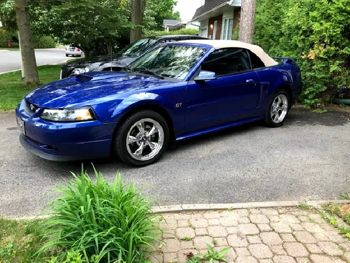 Je vends ma Ford Mustang GT décapotable 2002 bleue, à contre cœur, prêt à faire tourner les têtes et à offrir une expérience de conduite palpitante. Elle a de belles roues chromées qui brillent au soleil.