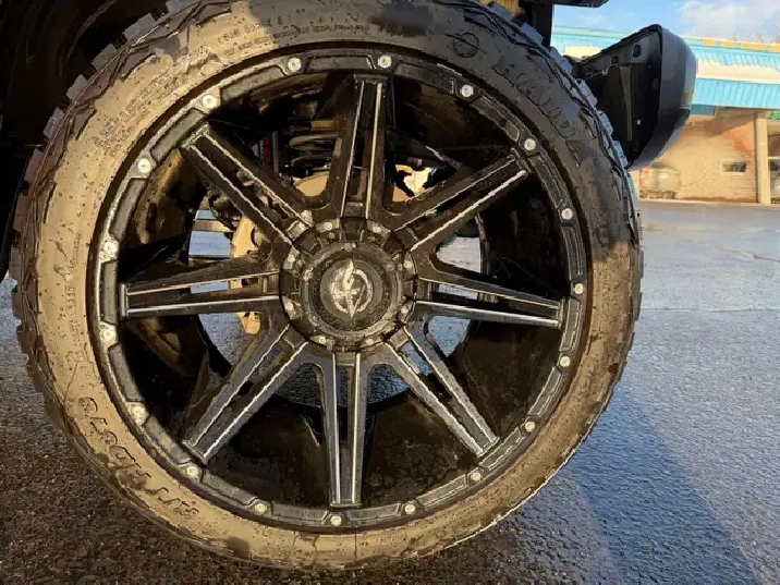 Equipped with a 5-inch Rough Country suspension lift, 22-inch wheels with an aggressive offset, giving it an absolutely mean and aggressive look.