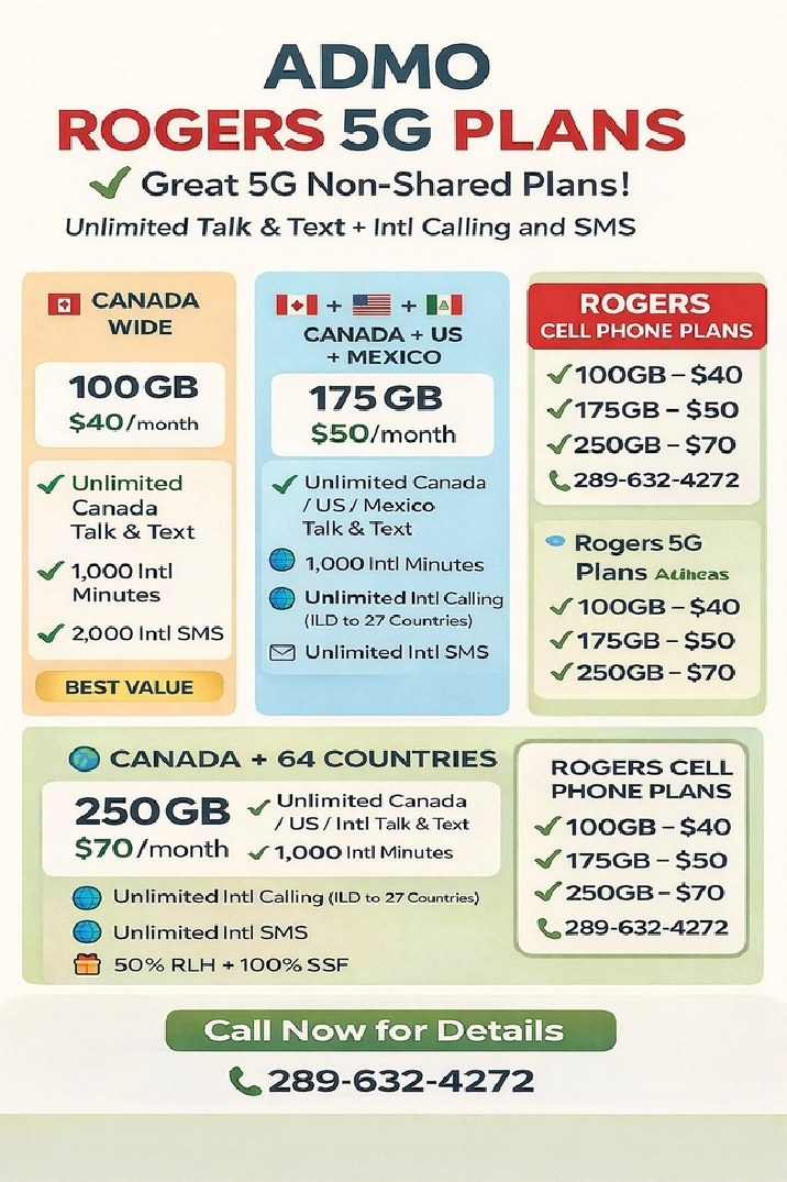 Get the best 5G SIM plans in Canada at affordable prices! 100GB for $40, Canada - USA 175GB for $50, Can-USA-MEX 250GB for $70. Can 64 Countries Unlimited talk & text international calling options available. Call now: 289-632-4272