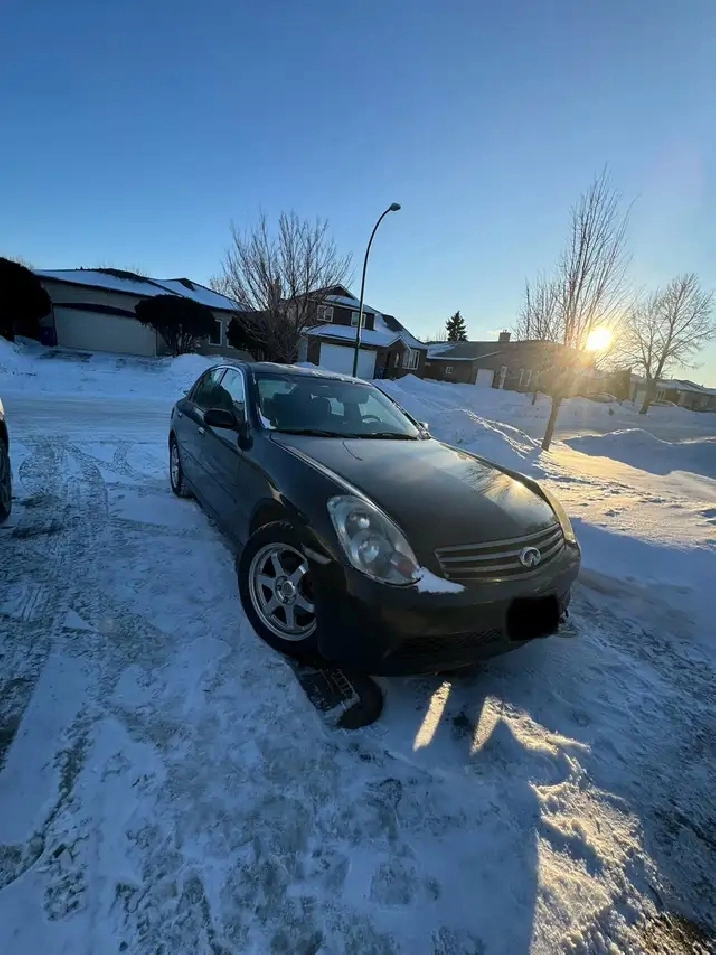 Hi selling my safetied 2005 Infiniti G35x AWD runs and drives good. Heat works good for winter and blows ice cold air for summer. Brand new winter tires come with it “ currently on vehicle” and a set of summer tires. Front right strut is starting to make noise and will need replacement. Air bag light came on when battery died not too sure what the reason is for that. Cars safetied until Feb 27Th. Will be selling it as is without doing the repair. If I don’t sell it prior of safety I will replace the strut re safety and price will go up. Vehicles navigation also stopped working when battery died was told it could be the fuse but need to remove the head unit in order to change fuse which I don’t want to put time into. Price is $5000 firm. If you have anymore information feel free to text or call me at 204-588-8468 will update pictures once personal belongings are taken out. Safety was done at aprox 186,000 km put no more then 1000 km on it. Vehicle was a spare vehicle barely driven no longer need it or have the space.