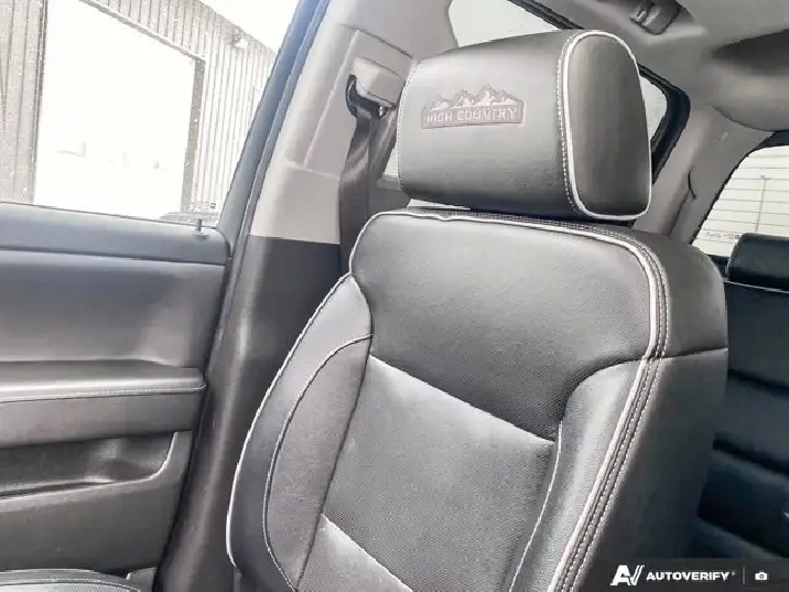 - High Country includes High Country brushed metal sill plate, (AN3) front full-feature leather-appointed bucket seats, (KQV) heated and vented seats, (K4C) Wireless Charging, (B58) colour-keyed carpeted floor mats, (D07) centre floor console, (UQA) Bose sound system, (NZJ) 20" chrome wheels, (IO6) MyLink 8" Diagonal Colour Touch audio system with Navigation, (QSS) P275/55R20 all-season, blackwall tires, (UD5) Front and Rear Park Assist, (VB5) body-colour front bumper, (VT5) body-colour rear bumper, unique chrome grille, (V76) Black recovery hooks, (VQZ) polished exhaust tip, LPO, (CTD) cargo tie downs, dealer-installed (4), (BVQ) chrome assist steps, (Y86) Enhanced Driver Alert Package (which includes (UEU) Forward Collision Alert, (UHX) Lane Keep Assist, (TQ5) High Beam assist, (UHY) Low Speed Forward Automatic Braking and safety alert seat, (UVD) heated steering wheel, (JF4) Power Adjustable Pedals and (JL1) trailer brake controller