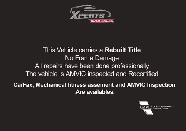 THIS UNIT CARRIES A REBUILT TITLE DUE TO DAMAGE ON FRONT END ( NO FRAME OR ENGINE DAMAGE). All repairs have been done professionally, and the vehicle is AMVIC inspected at a licensed facility. Extended warranty options are available, and the coverage can go up to 4 years.