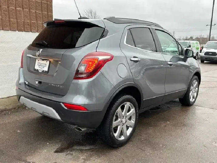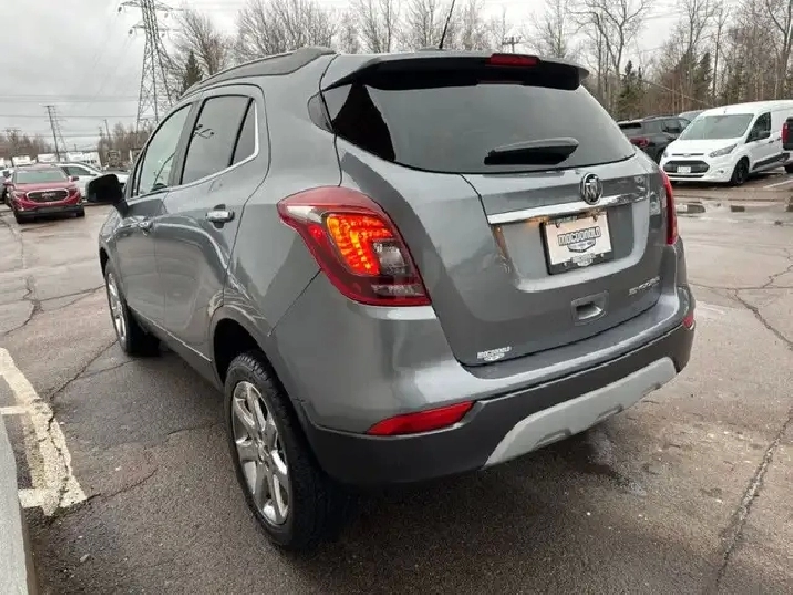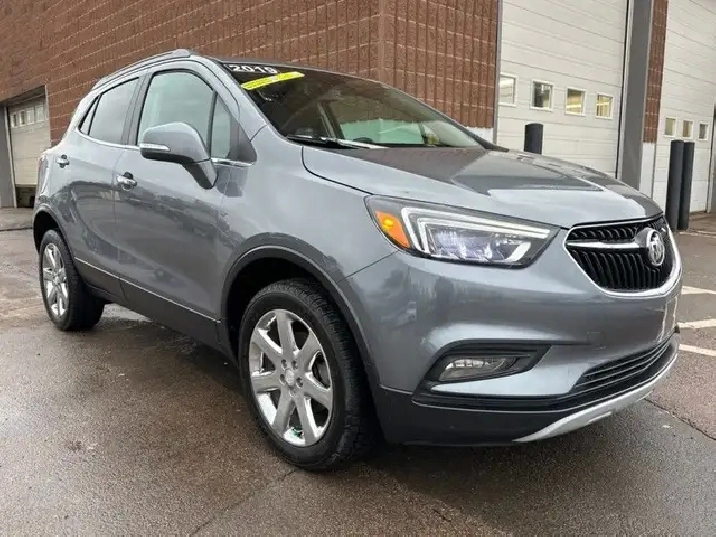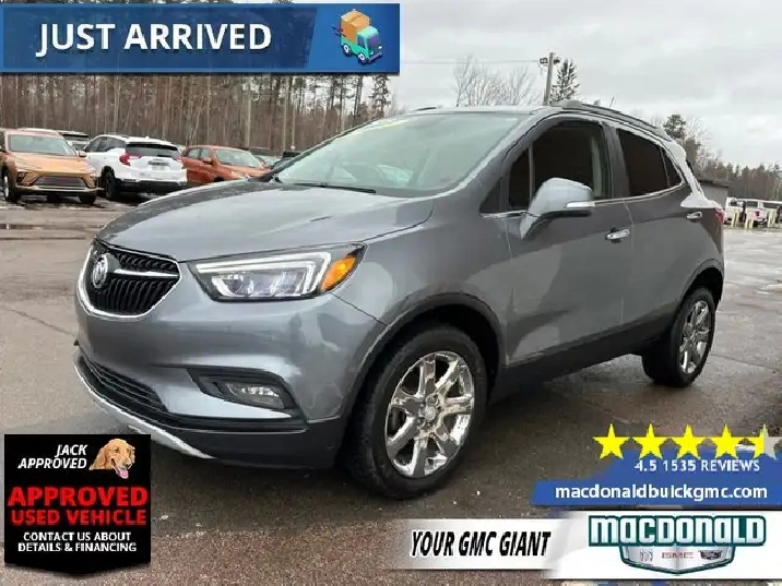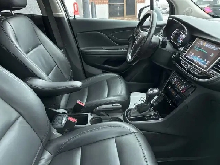 Our Encore's trim level is Essence. This top trim Essence Encore adds remote start, memory driver seat, heated front seats and steering wheel, blind spot monitoring with rear cross traffic alert, LED lighting, fog lamps, dual zone automatic climate control, auto dimming rear view mirror, 120V power outlet, power passenger seat, and upgraded aluminum wheels to the base model features like 8 inch touchscreen, Apple CarPlay and Android Auto capability, Bluetooth, SiriusXM, Siri EyesFree and voice recognition, USB and aux jacks, customizable Driver Information Centre with colour display, 4G WiFi, power driver seat, active noise cancellation, Buick Connected Access and OnStar capable, flat folding front passenger and rear seats, hands free keyless entry, leather wrapped steering wheel with audio and cruise control, rear view camera, deep tinted glass, and heated power side mirrors with turn signals. This vehicle has been upgraded with the following features: Memory Seats, Heated Seats, Blind Spot Monitoring, Remote Start, Apple Carplay, Android Auto, Rear View Camera.