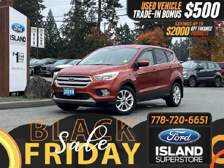 AWD, Heated Seats, Bluetooth, Turbocharged, Safety Tech, Remote Start, Multi-Zone A/C all packed into this sporty & efficient 2019 Ford Escape SE. Experience the perfect balance of performance, comfort, and practicality in the 2019 Ford Escape SE SUV. Powered by a turbocharged 1.5L EcoBoost engine paired with All-Wheel Drive, this fuel-efficient gas SUV delivers confidence on the road in any condition. Inside, enjoy thoughtful convenience features like heated front seats, smart device integration, and remote engine start all designed to enhance your daily drive. With standout safety features, ample cargo room, and modern connectivity, this Escape SE is ideal for families, commuters, and weekend adventurers alike. Drive with style, safety, and control in the 2019 Ford Escape SE. * Key Features: All Wheel Drive 1.5L EcoBoost Engine Turbocharged Automatic Transmission Heated Front Seats Heated Mirrors Remote Engine Start Smart Device Integration Bluetooth Connection WiFi Hotspot Apple CarPlay & Android Auto (via SYNC) Multi-Zone A/C Power Driver Seat Power Windows & Power Locks Rear Bench Seat Pass-Through Rear Seat Bucket Seats Illuminated Visor Mirror Rear Defroster Intermittent Wipers Rain Sensor Wipers Rear View Camera (Back-Up Camera) Driver Vanity Mirror & Passenger Vanity Mirror Tire Pressure Monitor Traction Control Brake Assist ABS 4-Wheel Disc Brakes Safety Features: Front Side Air Bag, Rear Head Air Bag, Front Head Air Bag, Knee Air Bag, Passenger Air Bag Sensor, Child-Safety Locks Driver Restriction Features Immobilizer Cruise Control Steering Wheel Audio Controls Trip Computer Power Steering Tilt Steering Privacy Glass Aluminum Wheels Fog Lights CD Player MP3 Capability Auxiliary Audio Input Satellite Radio AM/FM Stereo Take charge of every journey in the efficient and adventure-ready 2019 Ford Escape SE SUV. As BC's #1 rated dealer, we guarantee unbeatable trade-in values, payments, and prices on all our vehicles. Found a better offer? Bring us an official quote, and well beat it. Whether you have no credit, bad credit, or are in the process of rebuilding your credit, allow our finance specialists to assist you in finding the perfect vehicle. For mainland customers, we cover your BC Ferries fare with the purchase of a vehicle. Price is plus $899 Documentation Fee and is subject to additional government levies, PPSA fees, and applicable taxes. Prices, product specifications, and other information shown on this site are for informational purposes only, subject to change at any time without obligation, and may not be completely up to date or accurate. While we strive to ensure the accuracy of our inventory listings, human error may occur. Dealer #40142. Learn more at www.islandford.ca.