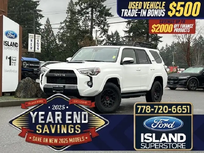 4.0L V6 power, full-time 4X4, TRD-tuned off-road suspension, panoramic view monitor, and Toyota Safety Sense™ make this SUV trail-ready and refined. The 2022 Toyota 4Runner TRD Pro is a rugged midsize gasoline SUV engineered for serious off-road performance without sacrificing everyday comfort. Its naturally aspirated V6 engine, 4X4 system, and heavy-duty suspension deliver proven durability on challenging terrain, while the TRD Pro trim adds premium interior touches and advanced technology. With robust safety features, intuitive infotainment, and legendary Toyota reliability, this 4Runner is an exceptional value for drivers who want authentic off-road capability paired with daily usability. — Key Features — 4.0L V6 DOHC engine 4X4 drivetrain 5-speed automatic transmission TRD Pro–tuned suspension Panoramic View Monitor Crawl Control Multi-Terrain Monitor Toyota Safety Sense Pre-Collision System with Pedestrian Detection Lane Departure Alert Blind Spot Monitor Rear Cross-Traffic Alert Heated front seats Touchscreen infotainment system Bluetooth wireless audio streaming 2022 Toyota 4Runner TRD Pro As BC's #1 rated dealer, we guarantee unbeatable trade-in values, payments, and prices on all our vehicles. Found a better offer? Bring us an official quote, and well beat it. Whether you have no credit, bad credit, or are in the process of rebuilding your credit, allow our finance specialists to assist you in finding the perfect vehicle. For mainland customers, we cover your BC Ferries fare with the purchase of a vehicle. Price is plus $899 Documentation Fee and is subject to additional government levies, PPSA fees, and applicable taxes. Prices, product specifications, and other information shown on this site are for informational purposes only, subject to change at any time without obligation, and may not be completely up to date or accurate. While we strive to ensure the accuracy of our inventory listings, human error may occur. Dealer #40142. Learn more at www.islandford.ca.