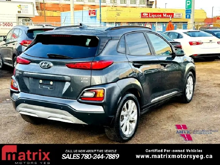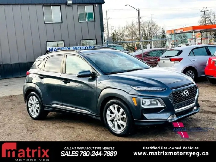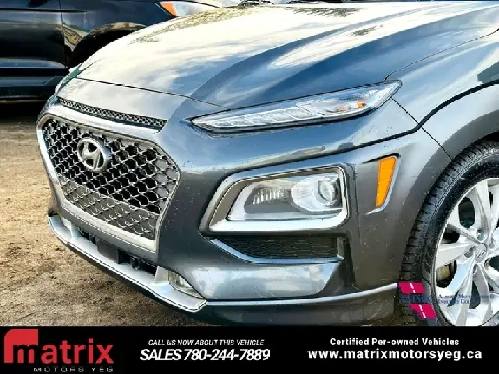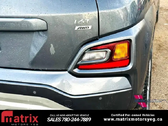 The 2020 Hyundai Kona 1.6T Ultimate AWD is a top-trim compact SUV with a 175-horsepower, turbocharged 1.6-liter engine and a 7-speed dual-clutch transmission paired with an all-wheel-drive system. Its features include a heads-up display, an 8-inch touchscreen with navigation, LED headlights, and a host of safety technologies like forward collision-avoidance with pedestrian detection and lane keeping assist. This trim also includes premium features such as a sunroof, leather upholstery, an 8-way power-adjustable driver's seat, and a wireless charging pad.