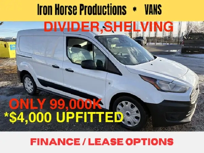CAN FINANCE or LEASE, 2021 FORD TRANSIT CONNECT $4K UPFITTED CARGO VAN, Super Clean White Exterior with High back Grey Captain Chairs, Well Optioned With, Divider Shelving, Factory Air, Tilt, Power Windows, Power Doorlocks, Power Mirrors, Sliding Side Door, Double Rear Doors, Sliding, Shelving, Good Tires, , AMVIC Safety, Only 99,000k !!! , WHOLESALE Priced at $24,900. CALL 403-612-1646 For Appointment to View. SELLING WHOLESALE To The Public Since 1984, Always a NICE Selection Of Cube and Cargo Vans in Stock