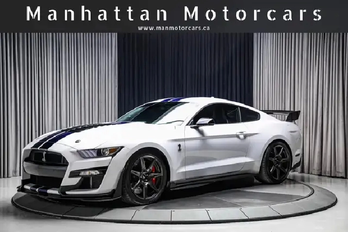 Shelby GT500, Amazing Oxford White with High Gloss Kona Blue Painted Stripe Exterior on Ebony Leather Interior with Grey Accents and Carbon Fiber Interior Trim, 20 Inch Exposed Carbon Fiber Wheels, Adjustable Strut Top Mounts, Exposed Carbon Fiber Lip, Exposed Carbon Fiber GT4 Track Wing, Rear Seat Delete, RECARO Leather Bucket Seats, Splitter Wickers, 12 Speaker Bang & Olufsen Sound System, Blind Spot Information System (BLIS) with Cross Traffic Alert, Voice Activated Touchscreen Navigation System, Apple Carplay, Android Auto, Heated Sideview Mirrors, Rearview Camera System, Remote Engine Start System, Leather and Alcantara Wrapped Flat Bottom Steering Wheel with Paddle Shifters, Auto Dimming Interior Mirror, Dual Zone Automatic Climate Control, Power Decklid Release, Remote Keyless Entry, Intelligent Access, Power Windows, and so many more options to list. A Must See.