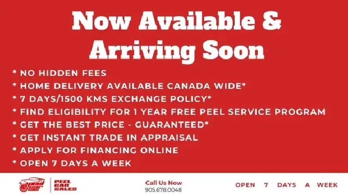 We are offering the LOWEST possible interest rates! Everyone is Approved! We are open 7 days except statutory holidays. Hundred Percent Price Match Policy based on trims, kms, CarFax, and colour. Free home delivery based on your postal code. Exchange Policy: Maximum 7 business days / 1500 kms if the dealer cannot fix the issue or concern. Certified Pre-Owned Program: 20242025: $499; 2023 and below: $799. Vehicle is not certified or e-tested and is not drivable unless the Safety and E-test is purchased; optional. We offer vehicles on finance or lease with the lowest interest rates O.A.C. Cash purchases welcome; admin fee may apply. Dealer may decline credit card purchases over $2,000. Prices subject to change; contact dealer. Locations: Mississauga 2701 Derry Road East, L4T 1A2; Oakville 333 Wyecroft Road, L6K 2H2. Vehicle information may not be 100% accurate please confirm with sales rep. Peel Car Sales has served GTA since 2014. Call/text 1 (647) 678-7778.