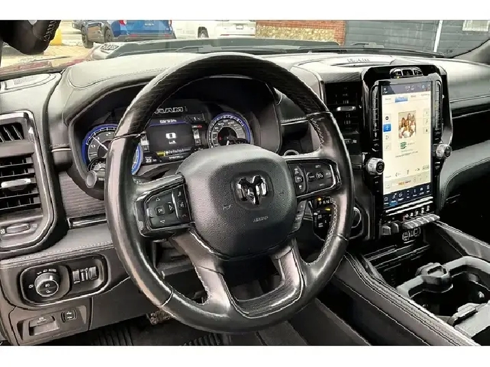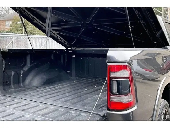 Luxury comfort meets serious utility in this 2022 Ram 1500 Limited Night Edition, where heated and ventilated premium leather seats, rear heated and ventilated seats, a hushed cabin, and 4 corner air suspension turn long drives into easy wins. The massive 12 inch Uconnect with navigation pairs with wireless Apple CarPlay and Android Auto, a 19 speaker Harman Kardon system brings concert clarity, a wireless charging pad keeps the console clean, and driver assists including adaptive cruise control, lane keep assist, forward collision warning, blind spot monitoring, park assist, and a 360 surround view camera add calm confidence. Outside, Granite Crystal paint, power side steps, and the paint matched Mopar X Factor one piece tonneau cover elevate both style and function, with a sleek over rail fit, gas strut lift for easy access, and an integrated lock that keeps cargo secure in all weather, while a Class IV hitch, trailer brake control, and the smooth 5.7L eTorque V8 handle work and weekends. One Owner history seals a standout, fully loaded truck.