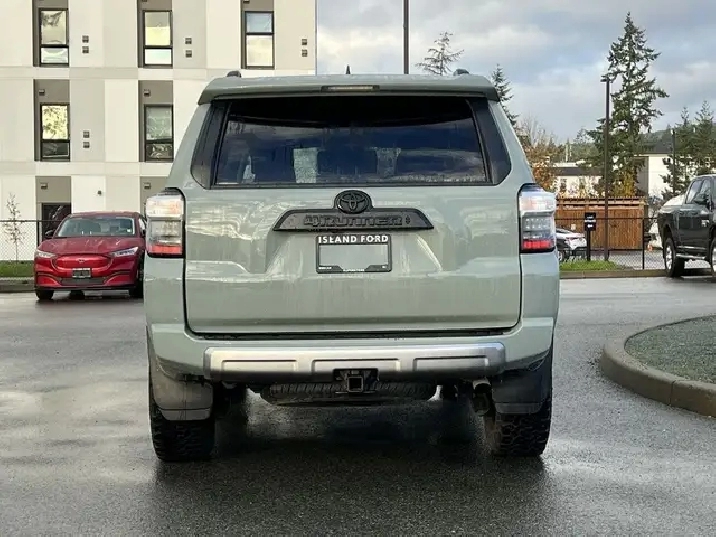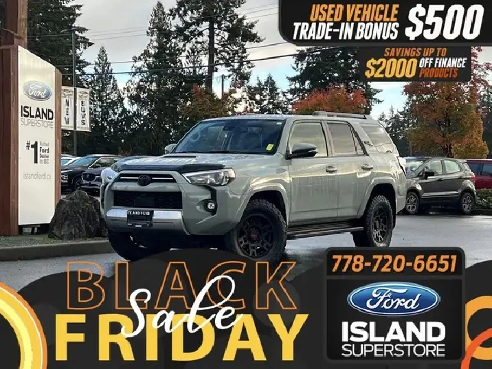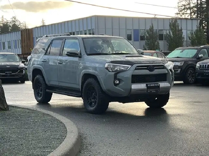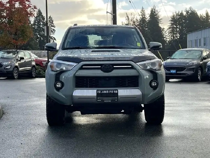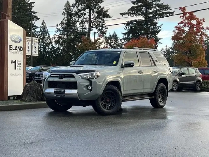 4x4, heated seats, adaptive cruise, and Toyota Safety Sense this SUV blends off-road strength with comfort and cutting-edge protection. The 2022 Toyota 4Runner TRD Off Road 4x4 delivers rugged capability with refined comfort. Its 4.0L V6 engine and automatic transmission provide dependable power, while the TRD Off Road setup ensures confidence on any terrain. Inside, you will find a feature-rich cabin with advanced safety systems, connectivity options, and premium materials. Whether you are tackling trails or cruising through the city, this fuel-efficient gas-powered SUV combines Toyota reliability with everyday practicality. * Key Features: 4.0L V6 gas engine 4x4 drivetrain Automatic transmission 7-passenger seating Lunar Rock exterior with Black interior SUV body style Adaptive cruise control Lane departure warning Blind spot monitor and cross-traffic alert Front collision mitigation Stability and traction control Toyota Safety Sense advanced safety suite Power windows, locks, and mirrors Heated mirrors and heated front seats Air conditioning and multi-zone automatic climate control Premium synthetic seats with leather-wrapped wheel Keyless entry and push-button start AM/FM stereo with MP3 capability Satellite radio and auxiliary audio input Bluetooth connectivity and smart device integration Telematics with subscription services Wi-Fi hotspot Steering wheel audio controls and tilt steering Trip computer and illuminated visor mirrors Auto-dimming mirrors Backup camera Adaptive high-beam headlights and LED headlights Fog lights and daytime running lights Sunroof / moonroof Tow package and trailer hitch Running boards / side steps Aluminum wheels with all-season tires 4-wheel disc brakes with ABS and brake assist Driver adjustable lumbar and power seat Bucket seats with pass-through rear seat Rear bench and 3rd-row seating Integrated turn signal mirrors Power steering and cruise control Privacy glass and intermittent wipers Rear defroster Floor mats and premium trim finish Universal garage door opener Immobilizer and advanced security system Child-safety locks and driver restriction features Rear head and front side airbags Knee airbag and passenger airbag sensor Tire pressure monitoring system Requires subscription for connected services Built for adventure and comfort, the 2022 Toyota 4Runner TRD Off Road 4x4 delivers legendary durability, advanced safety, and all-terrain confidence in a bold and capable SUV. As BC's #1 rated dealer, we guarantee unbeatable trade-in values, payments, and prices on all our vehicles. Found a better offer? Bring us an official quote, and well beat it. Whether you have no credit, bad credit, or are in the process of rebuilding your credit, allow our finance specialists to assist you in finding the perfect vehicle. For mainland customers, we cover your BC Ferries fare with the purchase of a vehicle. Price is plus $899 Documentation Fee and is subject to additional government levies, PPSA fees, and applicable taxes. Prices, product specifications, and other information shown on this site are for informational purposes only, subject to change at any time without obligation, and may not be completely up to date or accurate. While we strive to ensure the accuracy of our inventory listings, human error may occur. Dealer #40142. Learn more at www.islandford.ca.