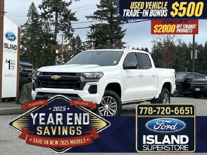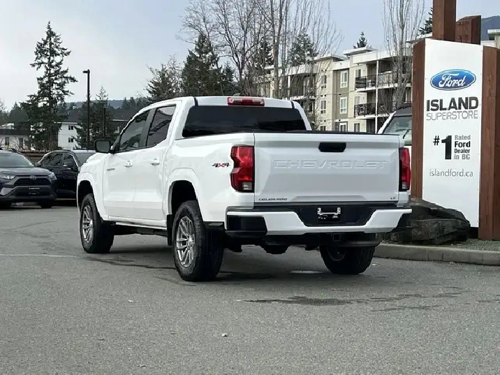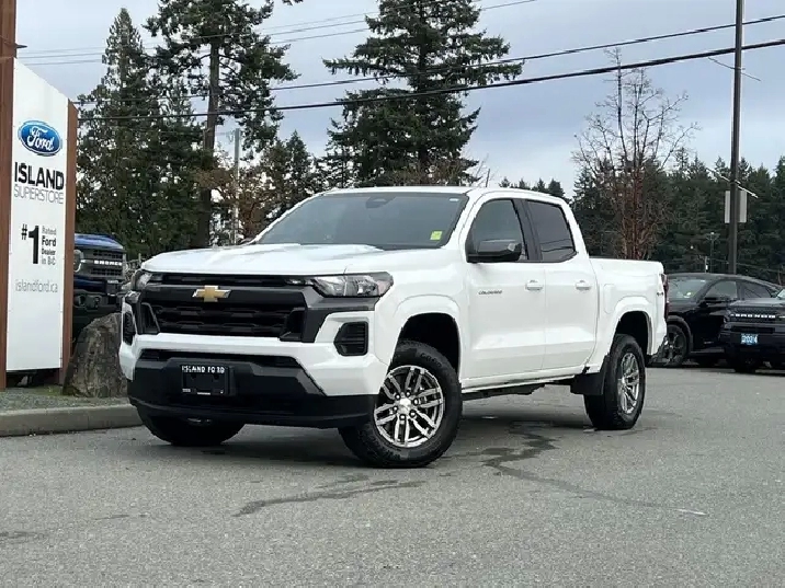 4WD Crew Cab, 2.7L Turbo Plus gas engine, 11.3? touchscreen with Google built-in, wireless Apple CarPlay/Android Auto™, and Chevy Safety Assist. The 2023 Chevrolet Colorado LT Crew Cab 4WD is a midsize gasoline pickup built for drivers who want modern tech, confident capability, and everyday comfort. Its 2.7L Turbo Plus engine paired with an 8-speed automatic transmission delivers responsive performance, while the 4WD system and trailer-ready features make it well suited for work or recreation. Inside, the Colorado LT stands out with a high-resolution 11.3-inch touchscreen, wireless smartphone integration, and a thoughtfully designed cabin that balances durability with comfort—making it a strong value in the midsize truck segment. — Key Features — 2.7L Turbo Plus gasoline engine 8-speed automatic transmission Four-wheel drive (4WD) Crew Cab body style 11.3 advanced colour touchscreen display with Google built-in Wireless Apple CarPlay Wireless Android Auto™ Chevrolet Safety Assist Automatic Emergency Braking Forward Collision Alert Front Pedestrian Braking HD rear vision camera Teen Driver mode Remote locking tailgate Automatic front headlamp & rear tail lamp control 2023 Chevrolet Colorado LT Crew Cab 4WD As BC's #1 rated dealer, we guarantee unbeatable trade-in values, payments, and prices on all our vehicles. Found a better offer? Bring us an official quote, and well beat it. Whether you have no credit, bad credit, or are in the process of rebuilding your credit, allow our finance specialists to assist you in finding the perfect vehicle. For mainland customers, we cover your BC Ferries fare with the purchase of a vehicle. Price is plus $899 Documentation Fee and is subject to additional government levies, PPSA fees, and applicable taxes. Prices, product specifications, and other information shown on this site are for informational purposes only, subject to change at any time without obligation, and may not be completely up to date or accurate. While we strive to ensure the accuracy of our inventory listings, human error may occur. Dealer #40142. Learn more at www.islandford.ca.