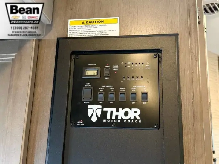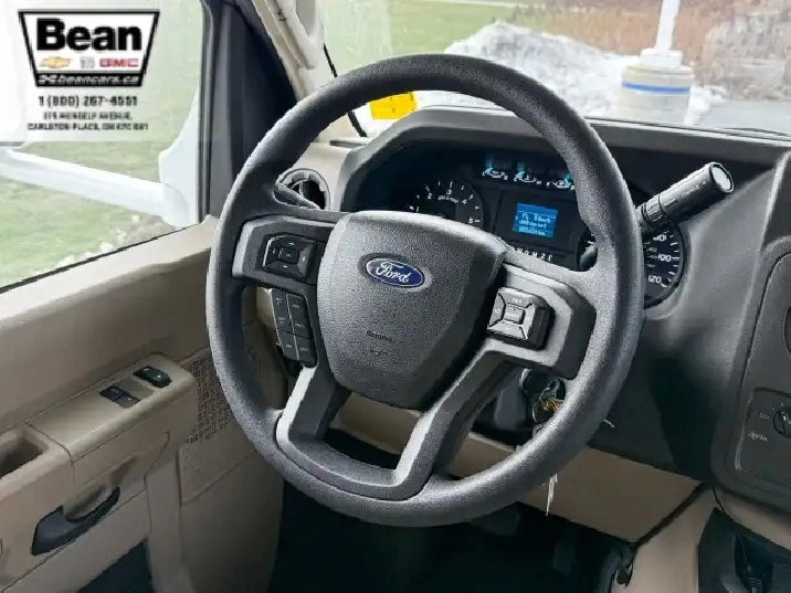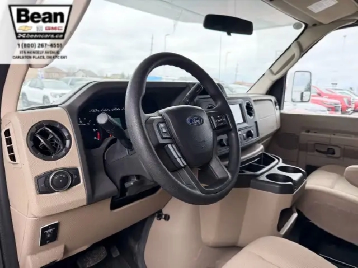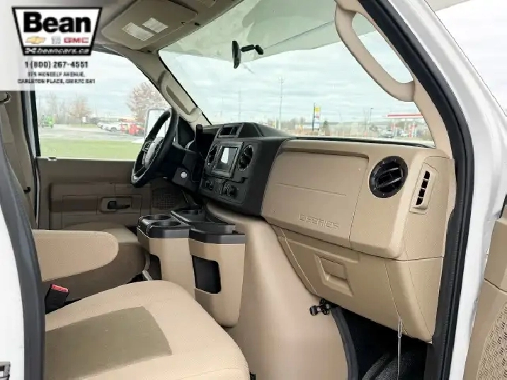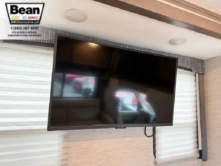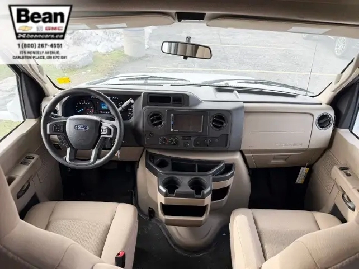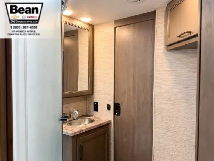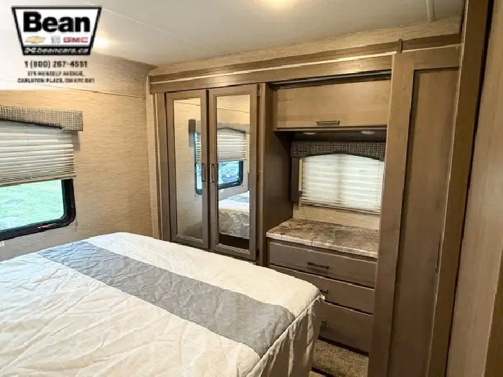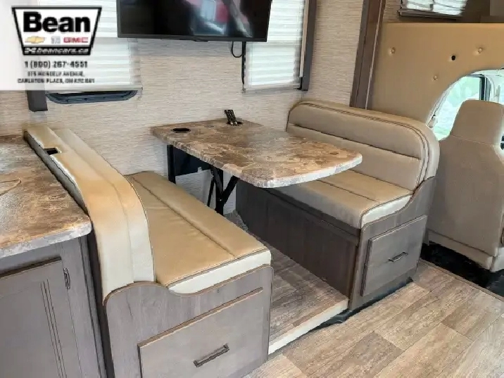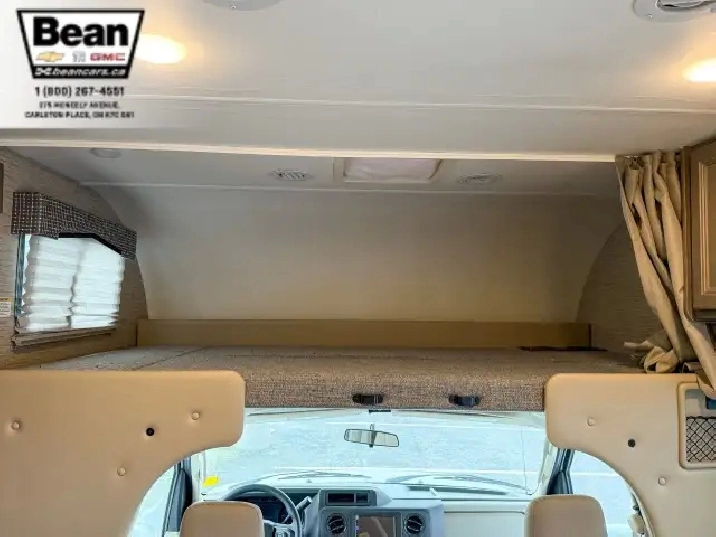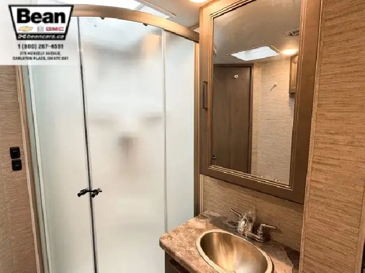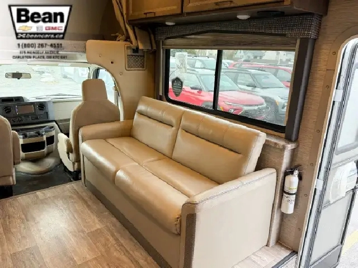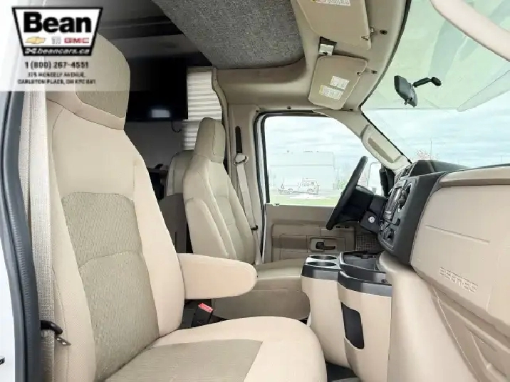 The bathroom keeps everyone comfortable on the road with a bright glass-door shower and skylight, a toilet and sink, and a convenient medicine cabinet for toiletries and everyday essentials. Behind the wheel, the Ford E450 chassis paired with the 7.3L V8 gives you plenty of power and confidence, while leatherette captains seats, cruise control, and a 7 touchscreen with Apple CarPlay and Android Auto make driving surprisingly easy. Once youre parked, electric stabilizer jacks and a 4,000-watt Onan generator simplify setup whether youre at a campsite or off-grid. Evenings under the LED-lit power awning feel relaxed and effortless, and with great towing capacity and ample exterior and interior storage throughout, this coach is ready for big adventures, long getaways, and unforgettable family moments.