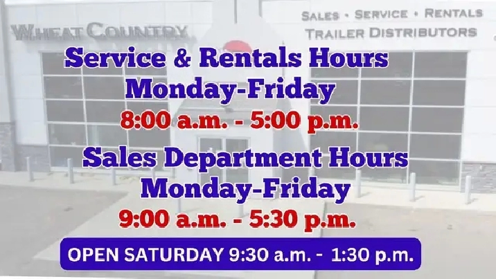 Available ON THE SPOT FINANCING O.A.C. Price advertised plus taxes and fees. DL#915572. At Wheat Country, we believe your purchase should also be complimented with individual one-on-one tailored finance options. We will also provide quality after-sale service! PEACE OF MIND is our NUMBER ONE GOAL!