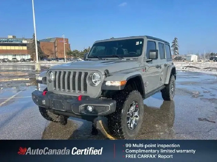 - QUICK ORDER PACKAGE 22R RUBICON -inc: Engine: 2.0L DOHC I-4 DI Turbo w/ESS Transmission: 8-Speed TorqueFlite Auto,TIRES: LT285/70R17C BSW ON/OFF-ROAD (STD),4.10 REAR AXLE RATIO (STD),BLACK FREEDOM TOP 3-PIECE HARDTOP -inc: Freedom Panel Storage Bag Rear Window Defroster Rear Window Wiper w/Washer,TRANSMISSION: 8-SPEED TORQUEFLITE AUTO -inc: Selec-Speed Control,STING-GREY,GVWR: 2 630 KGS (5 800 LBS) (STD),WHEELS: 17 X 7.5 POLISHED ALUMINUM W/BLACK,BLACK CLOTH SEATS W/RUBICON LOGO & UTILITY GRID,ENGINE: 2.0L DOHC I-4 DI TURBO W/ESS,Four Wheel Drive,Locking/Limited Slip Differential,Locking/Limited Slip Differential,Keyless Entry,Power Door Locks,Premium Sound System,Tow Hooks,Traction Control,Automatic Headlights,Keyless Start,Requires Subscription,Tires - Rear All-Terrain,MP3 Capability,Cloth Seats,Power Mirror(s),Stability Control,Tire Pressure Monitor,Driver Illuminated Vanity Mirror,Driver Air Bag,Child Safety Locks,Driver Adjustable Lumbar,Pass-Through Rear Seat,Smart Device Integration,Driver Adjustable Lumbar,Cruise Control,4-Wheel Disc Brakes,Tow Hooks,Floor Mats,Power Steering,A/C,Heated Mirrors,Intermittent Wipers,Driver Vanity Mirror,Satellite Radio,Premium Sound System,Multi-Zone A/C,Passenger Air Bag,HD Radio,WiFi Hotspot,Security System,Passenger Vanity Mirror,Passenger Air Bag Sensor,Navigation System,Aluminum Wheels,Climate Control,Convertible Soft Top,Power Door Locks,Auxiliary Audio Input,Power Door Locks,Front Side Air Bag,Passenger Illuminated Visor Mirror,Trip Computer,Adjustable Steering Wheel,Power Windows,Daytime Running Lights,Traction Control,Brake Actuated Limited Slip Differential,Bucket Seats,Variable Speed Intermittent Wipers,Rollover Protection Bars,Back-Up Camera,Power Windows,Bluetooth Connection,Fog Lamps,Power Door Locks,Telematics,Conventional Spare Tire,Brake Assist,Universal Garage Door Opener,Navigation System,Immobilizer,Keyless Entry,Rear Bench Seat,ABS,Bluetooth Connection,Locking/Limited Slip Differential,Trip Computer,Requires Subscription,Steering Wheel Audio Controls,Auto-Dimming Rearview Mirror,Privacy Glass,Tires - Front All-Terrain