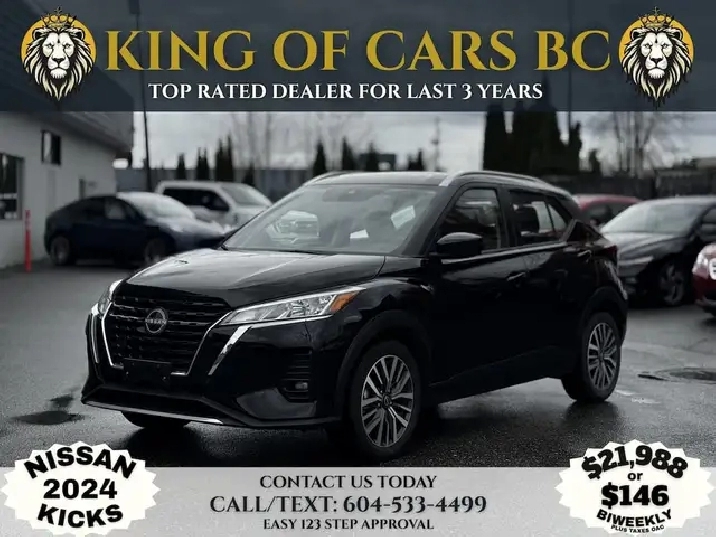 2024 NISSAN KICKS SV Stock Number: P215831 VEHICLE OPTIONS : LED Headlights, Alloys, 5 Passenger Seating, Push Start, Backup, Heated Seats, Heated Steering Wheel, Automatic Emergency Braking, Adaptive Cruise Control, Bluetooth. Available warranty options Call or Text: 604-533-4499 Apply Online: kingofcarsbc.com Dealer #31301 Plus an administration fee of $895, finance fee of $995 and Applicable Taxes All finance options are subject to OAC (On Approved Credit)
