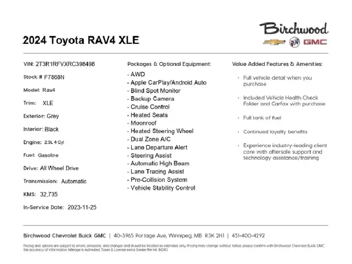 Experience the RAV4's versatility and advanced technology for yourself. Visit Birchwood Chevrolet Buick GMC today to schedule a test drive or start your purchase online. Our knowledgeable staff is ready to answer any questions and help you find the perfect SUV for your lifestyle. Don't miss this opportunity to own a nearly-new Toyota RAV4 with all the features you desire!
