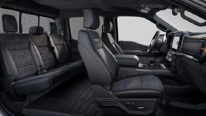 Inside, the F-150 Tremor® cabin is comfortable and tech-forward with a 12″ productivity screen, dual-zone electronic A/C, tilt/telescoping steering wheel, dual visors with mirrors, and power locks/windows. The unique Black Sport Cloth 40/Console/40 seating provides durability for work or play. Adaptive cruise control, rear view camera, reverse sensing system, and Intelli Access with push start (via SYNC4® with 12″ screen) ensure a connected and safe driving experience.