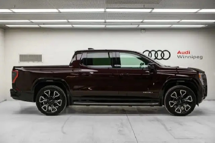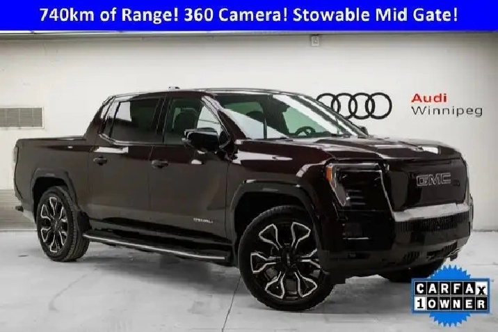 Save over $20,700 NO LUXURY TAX on this ultra low KM 2025 GMC Sierra EV Max Range Denali that just arrived in stunning Dark Ember Tintcoat! Tons of factory warranty remaining plus up to 740km of all-electric range and the ability to tow up to 10,000lbs! Plus you'll love being pampered by a long list of luxurious features including: heated and ventilated leather seating w/drive memory, heated steering wheel, a full glass roof, 360 degree camera, adaptive cruise control, wireless Apple Carplay & Android Auto, split folding mid-gate (just like your old Chevy Avalanche you used to love!), MultiPro tailgate and so much more. With 760 horsepower & 765 lb feet of torque, the ability to charge 160km of range in as little as 10 minutes and 4-Wheel Steering w/Crab Walk capabilities, this rare find is sure to impress in every way!!