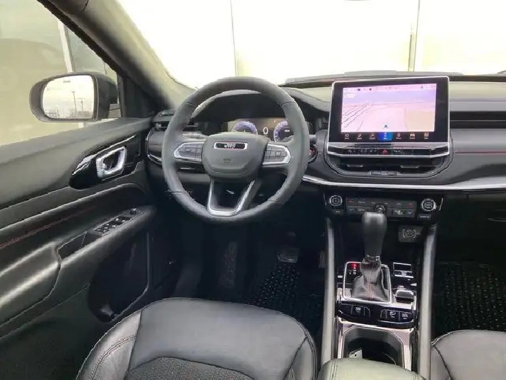 *Premium Cabin:* Black interior with bold *Ruby Red accent stitching* on leather-faced seats.
